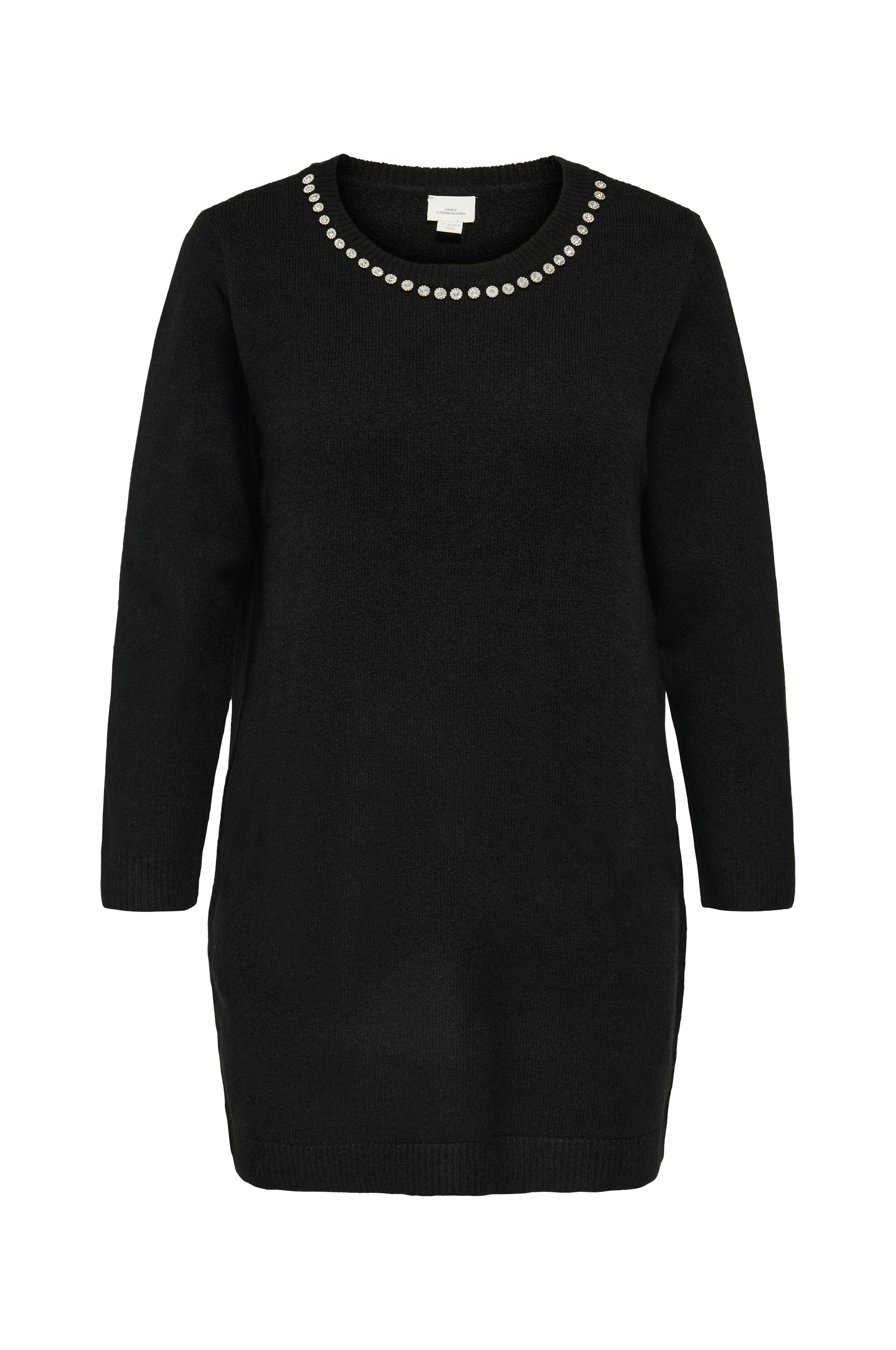 • Mjuk, stickad klänning• Rund, ribbad halsringning med strasstenar runt om på framsidan• Ribbstickning i ärmsluten och i nederkanten• Längd: 92 cm i storlek S• Plusstorlekar
