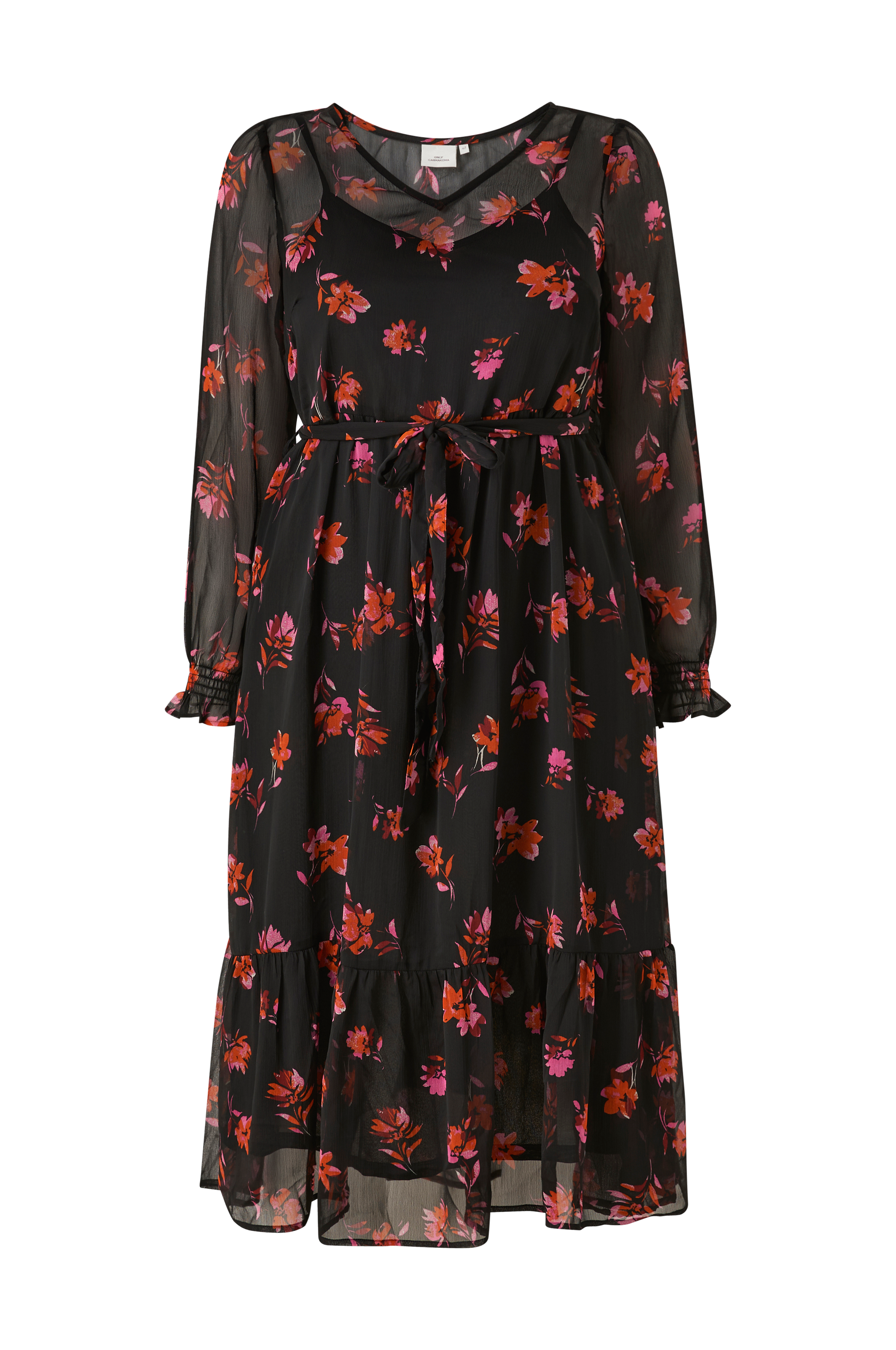• Halvtransparent tyg med tryckt mönster• V-ringad hals• Långa ärmar med smock och volang i ärmsluten• Underklänning med justerbara axelband• Plusstorlekar• Längd: 124 cm i storlek 42