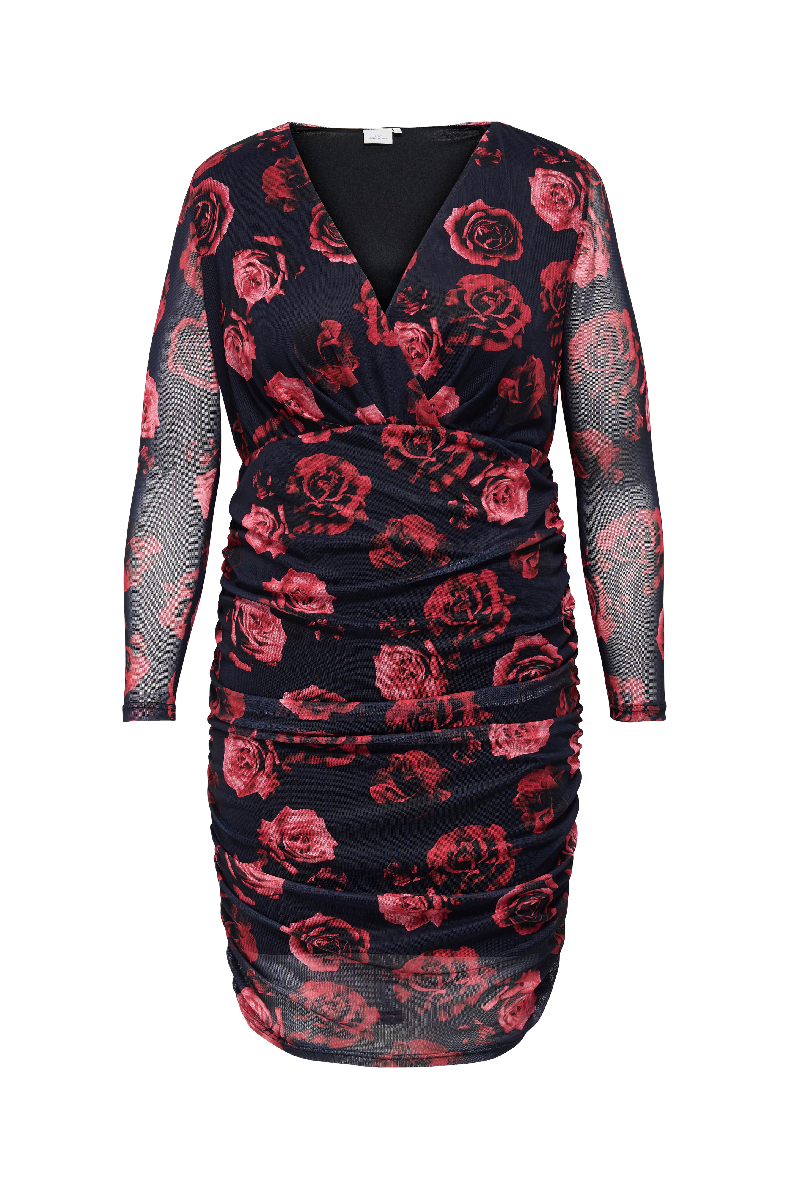• Blommönstrad klänning i mesh• V-ringad hals med omlottdesign• Långa, halvtransparenta ärmar• Resår i midjan• Kjol med drapering i sidorna• Fodrad• Längd: 120 cm i storlek S• Plusstorlekar