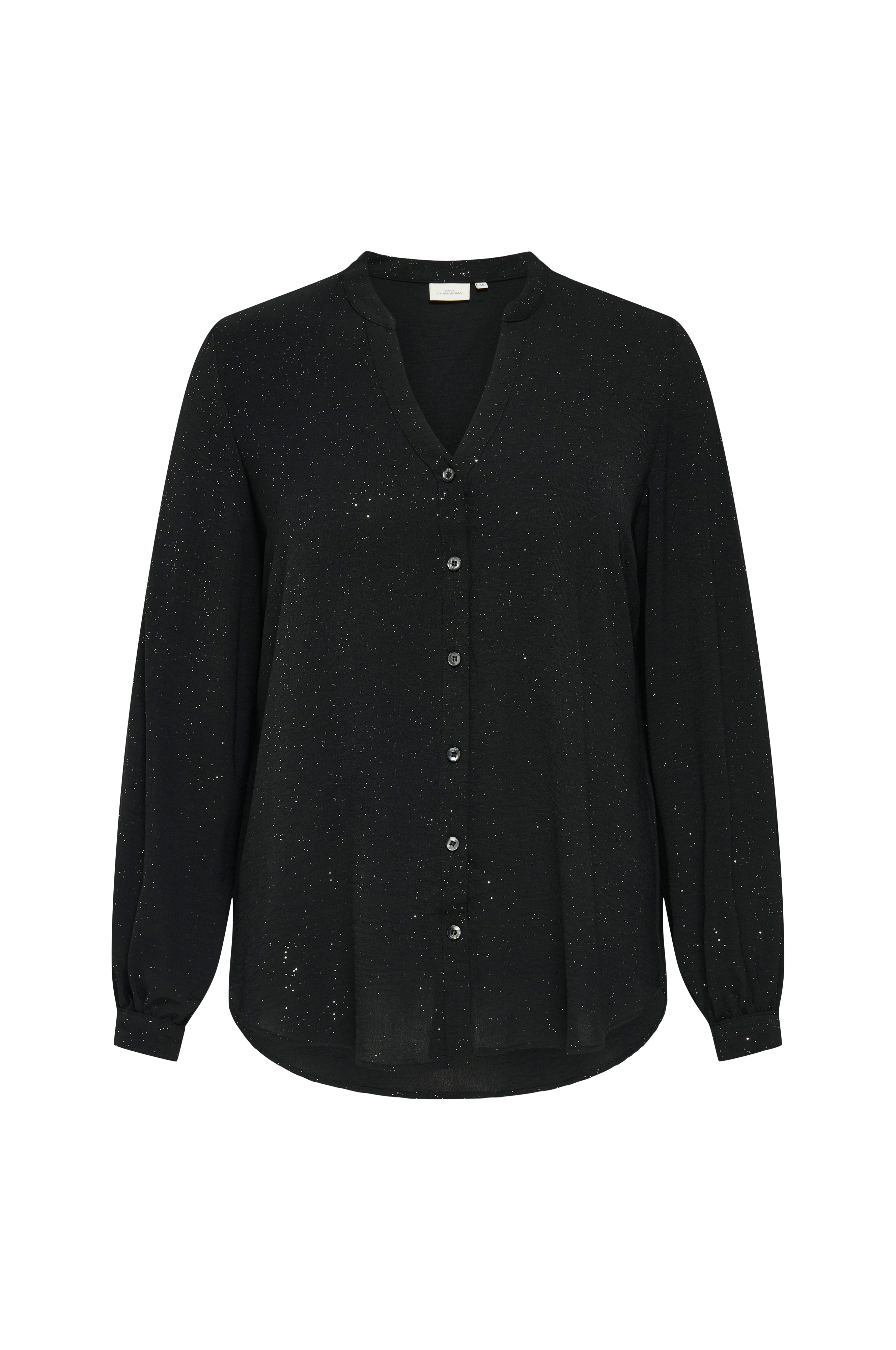 • Glittrig skjorta• V-ringning• Långa ärmar• Knapp i ärmsluten• Knappstängning• Rundad nederkant• Plusstorlekar