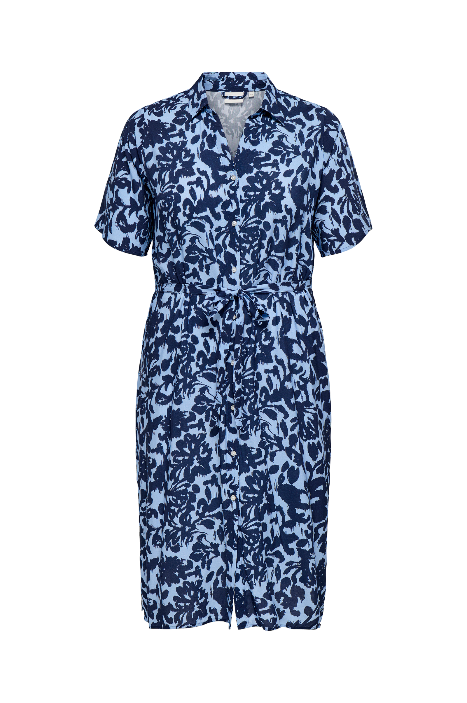 • Mönstrad klänning i viskos• Krage• V-ringning• Korta ärmar• Knappstängning• Avtagbart knytband• Slitsar nedtill i sidorna• Plusstorlekar• Längd: 119 cm i storlek 42