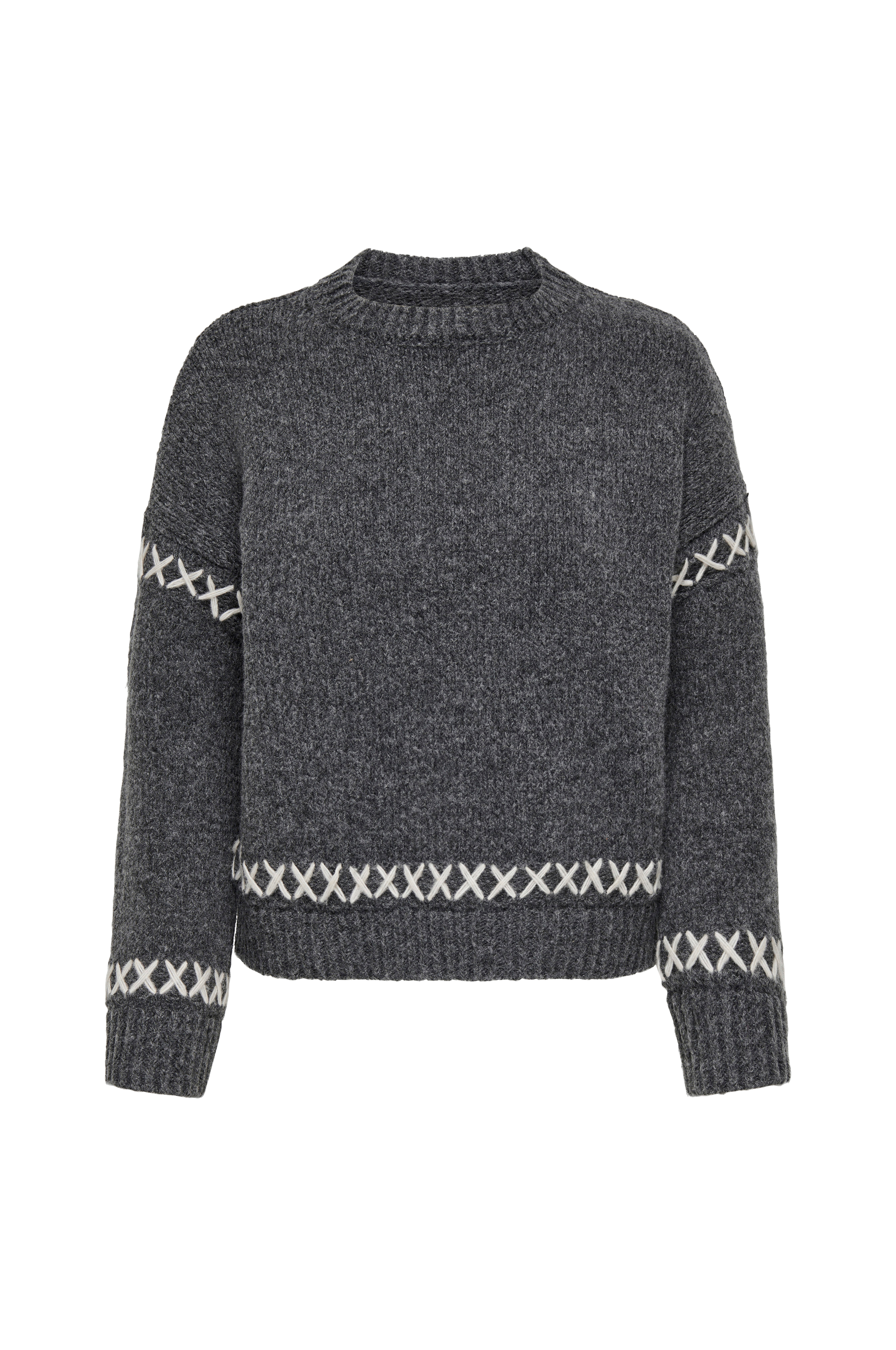 • Mjuk, stickad tröja• Mönsterstickade detaljer vid axlarna, i ärmsluten och nedtill• Rund, ribbad halsringning• Ribbstickning i ärmsluten och i nederkanten• Nerhasade axlar• Plusstorlekar