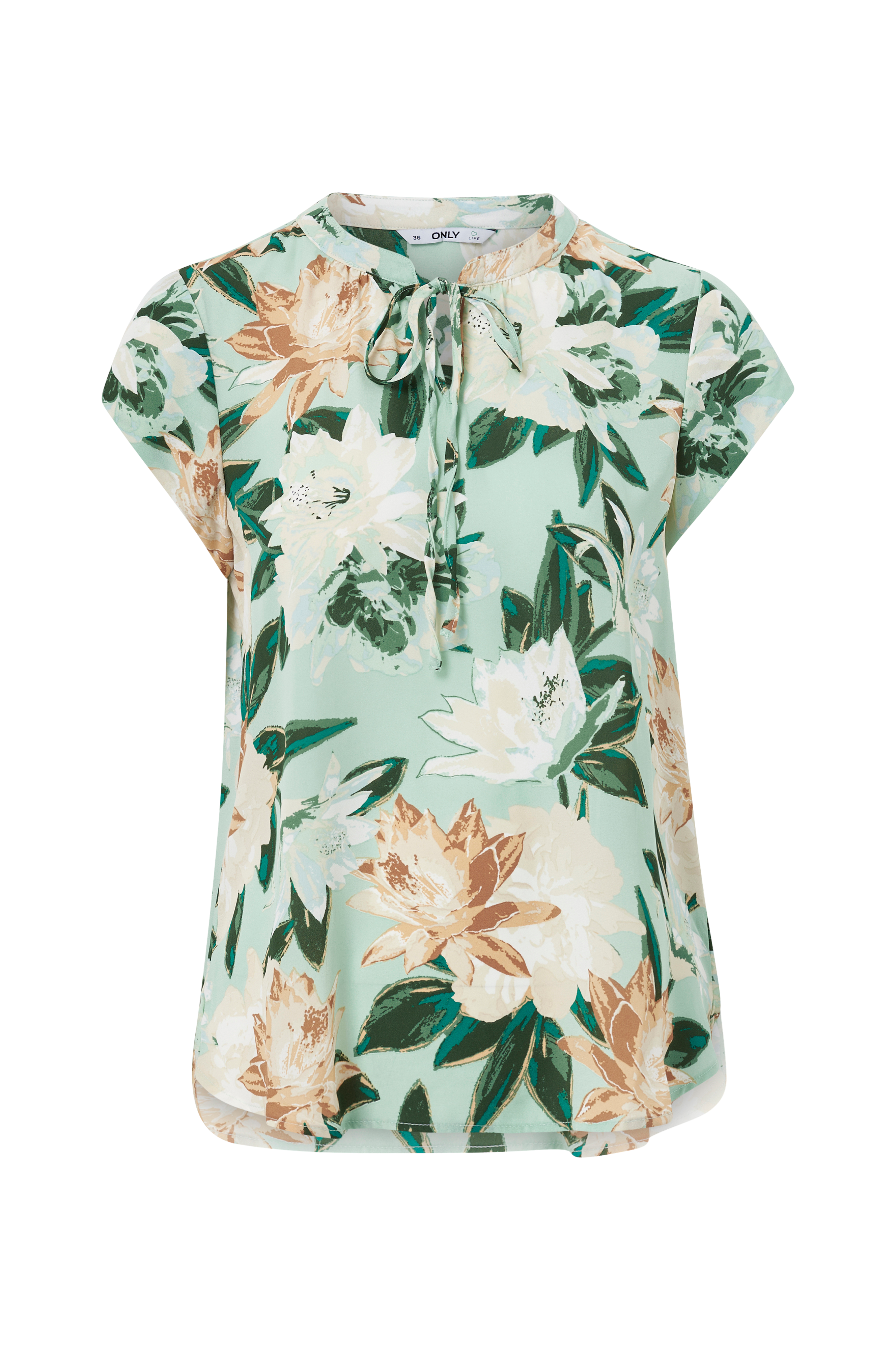 Rak modell med ledig form i vävd chiffong. Rund hals med påsydd kant och v-ringning fram med smalt knyt. Kort ärm och rundskurna sprund nertill i sidorna.