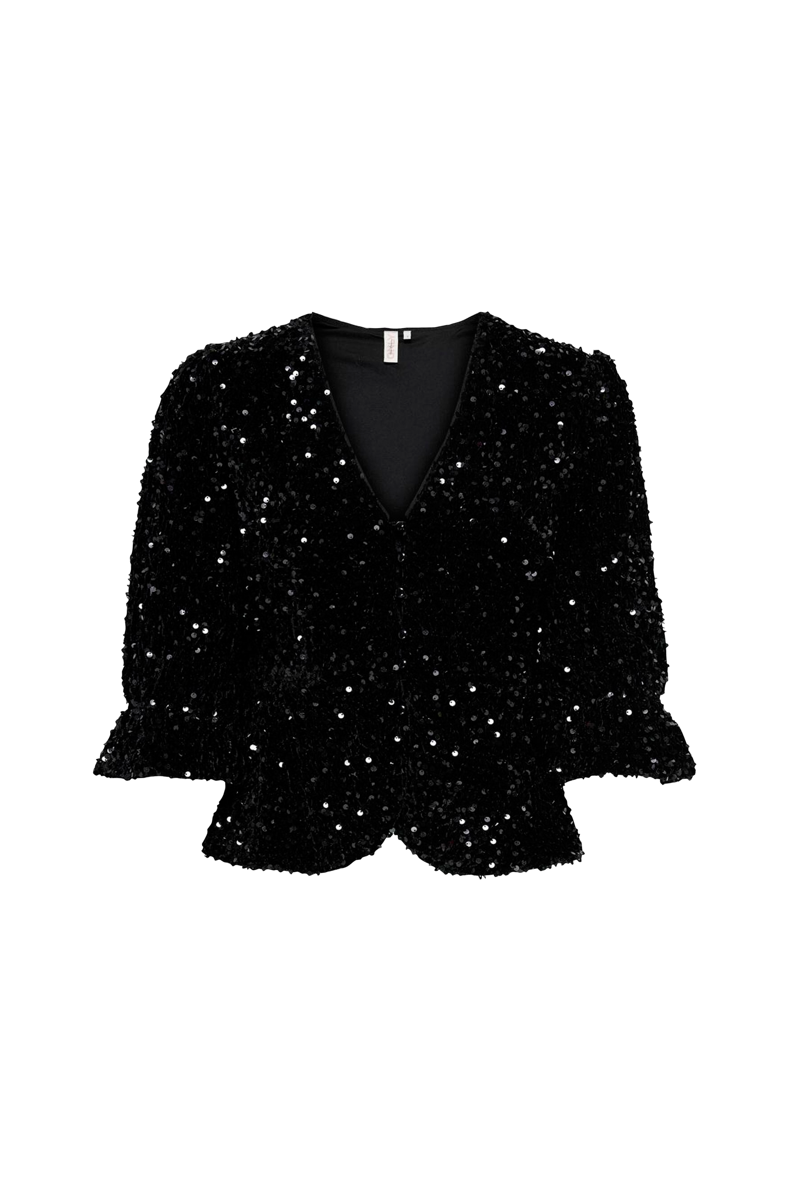 • Paljettblus med trikåfoder• V-ringad hals• Knappar• Resår i ärmsluten