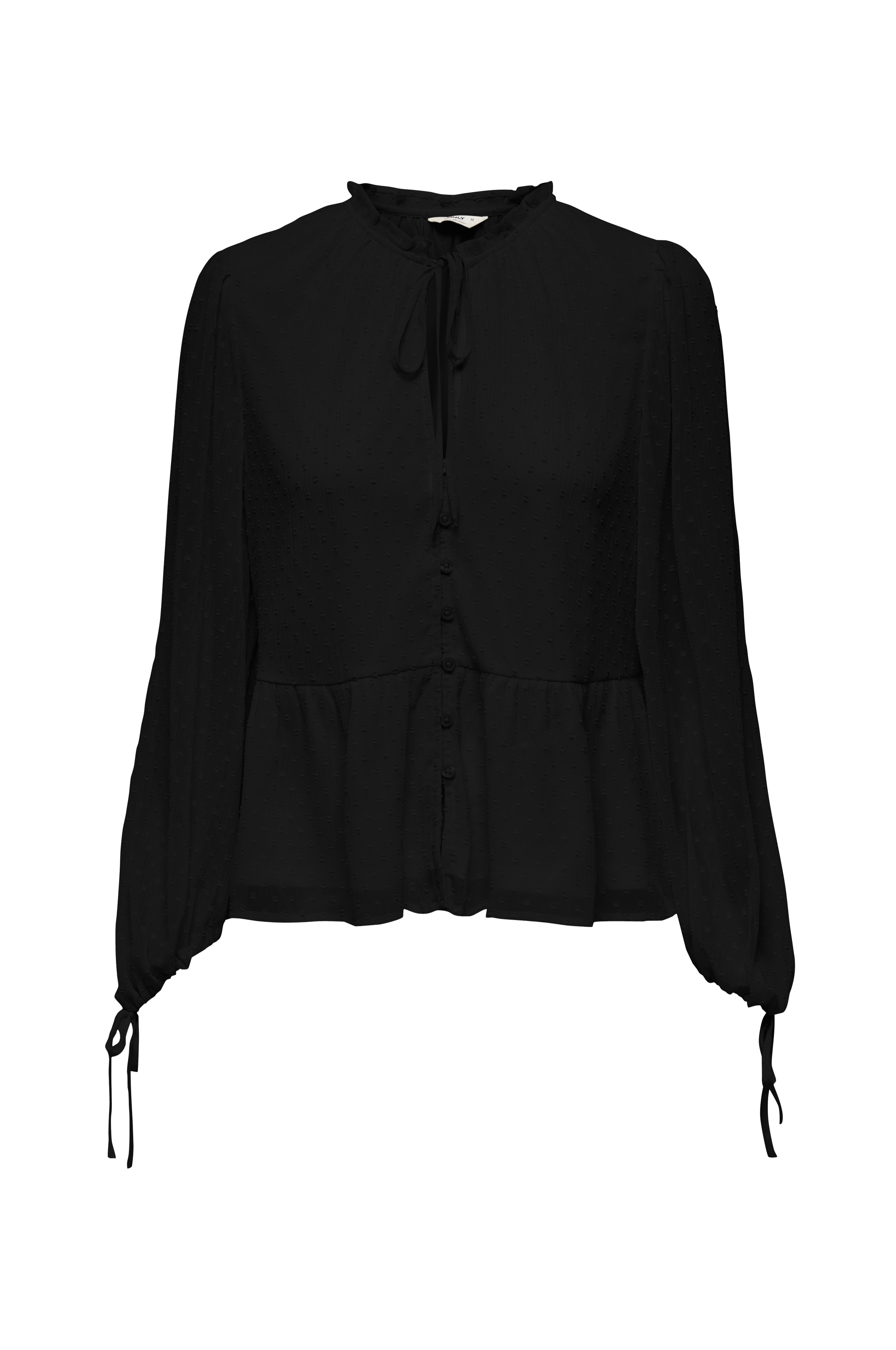 • Strukturmönstrad peplumdesign i chiffong• Rund hals med liten volang och knytband• Ögleknäppning fram• Lång, vid ärm med knytband i ärmsluten• Fodrad