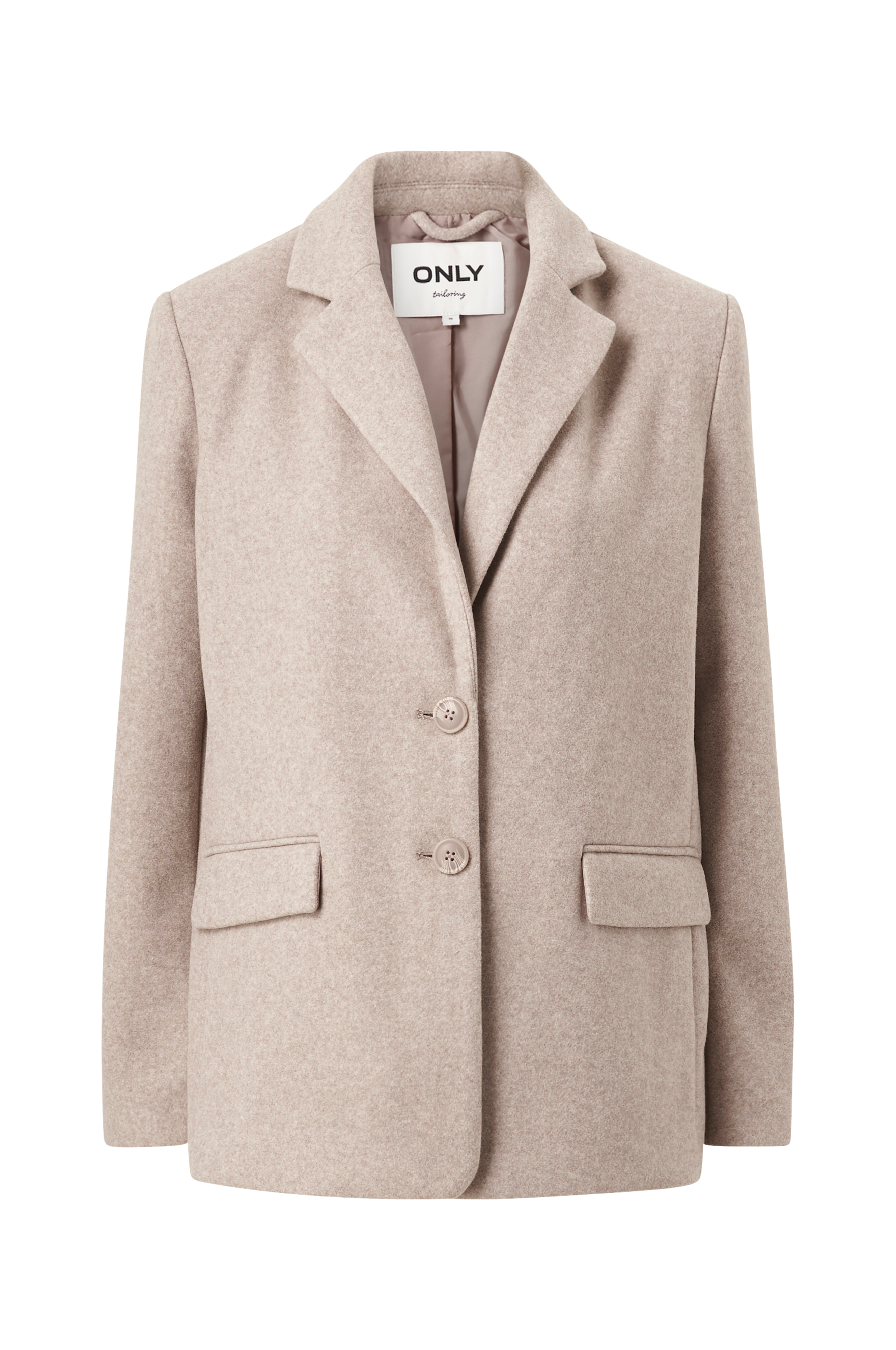 Jacka i kavajmodell med knappar och två fickor fram. Dekorativa knappar i ärmsluten och slits nedtill bak. Vävt foder. Längd ca 72 cm i stl 36.