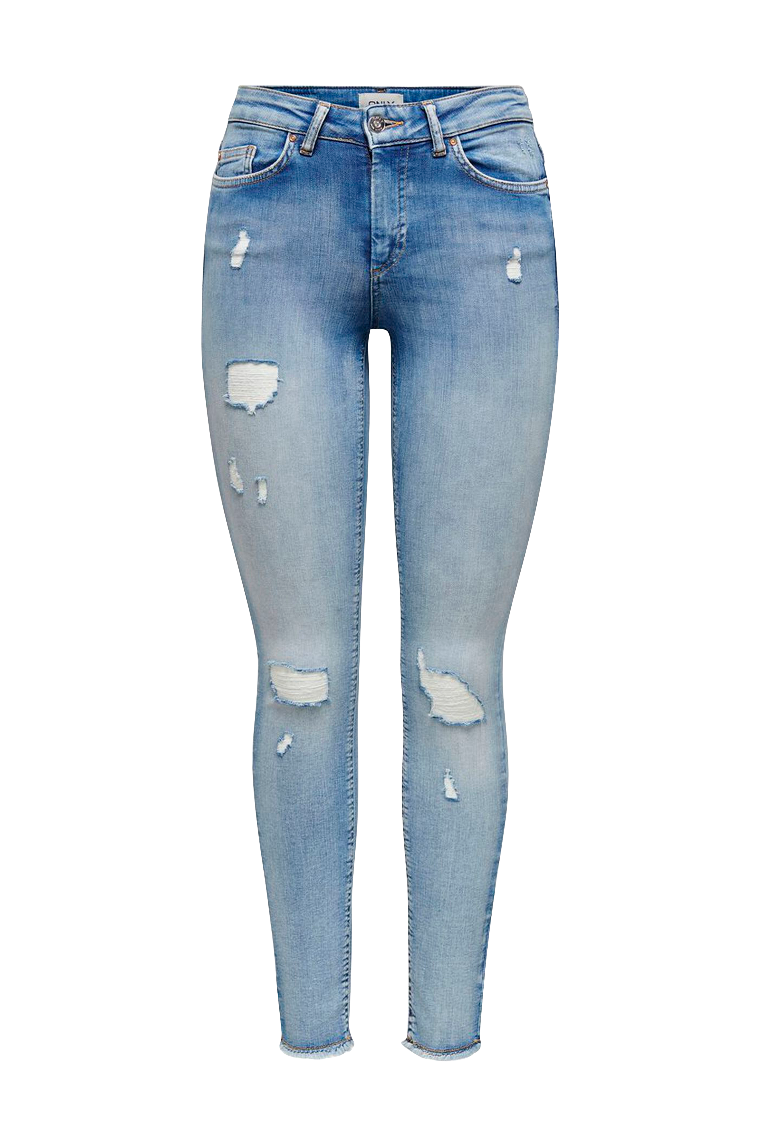 Jeans i stretchdenim med sliteffekter. Ankellång femficksmodell med normalhög midja och smal passform. Gylf med dragkedja. Fransade kanter i bensluten.