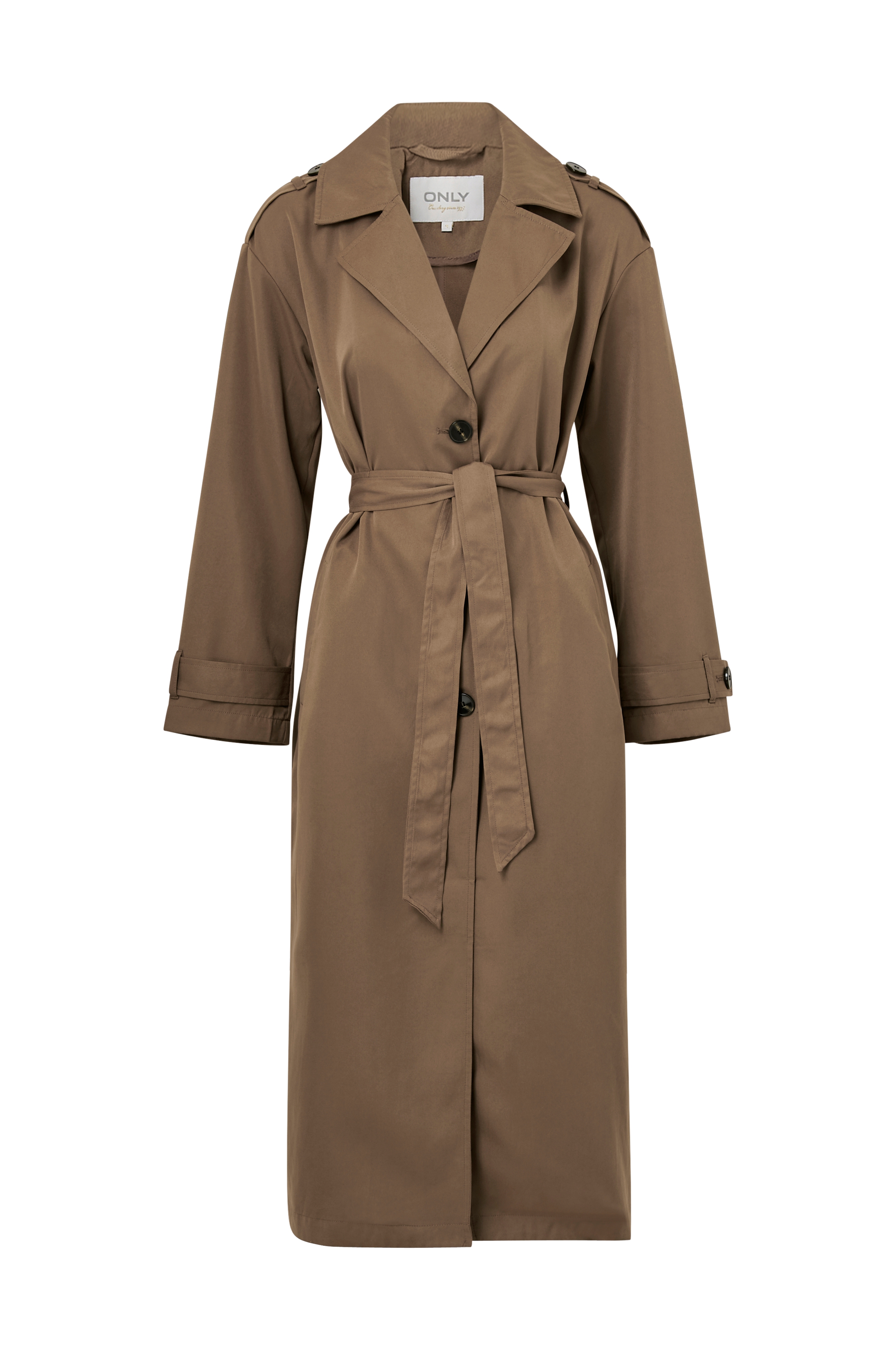 Lång trenchcoat med krage och slag, knappar fram samt två fickor. Knytskärp i midjan och rem och knapp på axlarna och i ärmsluten. Slits i nederkanten bak. Gjord i vävd kvalitet. Ofodrad. Längd ca 123 cm i stl S.