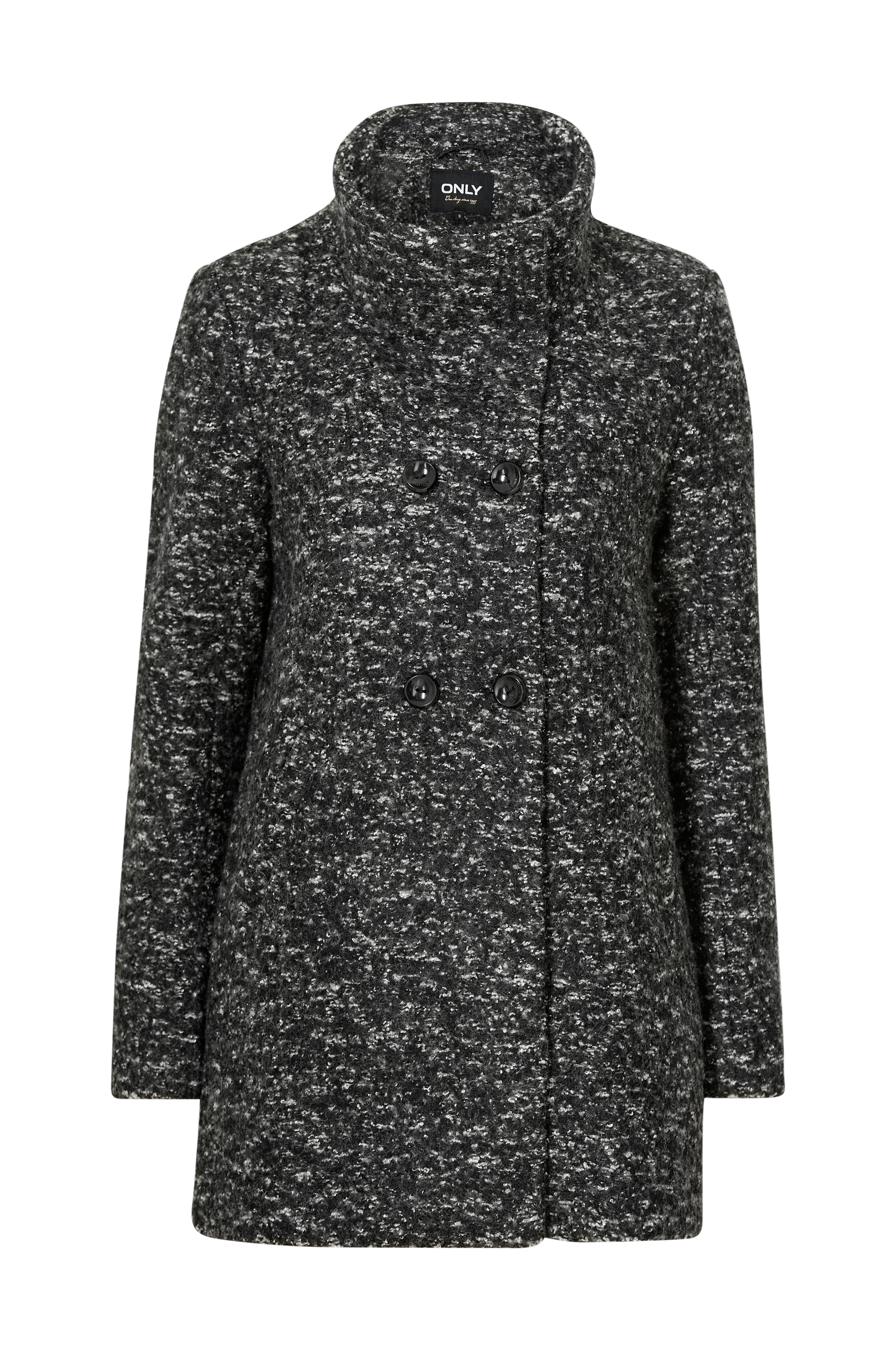 Kappa onlNewsophia Wool Coat från Only. Lite kortare modell med dubbelknäppning och markerad avskärning på bröstet. Hög krage med dold tryckknapp och två infällda fickor med liten, påsydd kant. Melerad kvalitet med filtad yta och vävt foder av återvunnen polyester. Längd ca 81 cm i stl S.