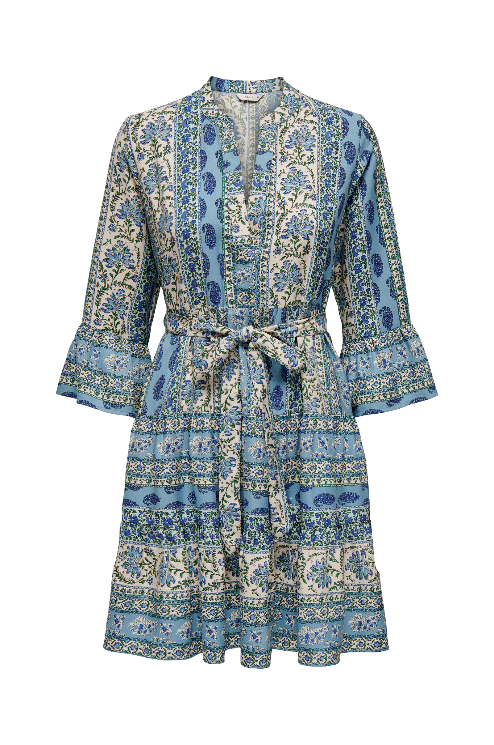 • Kort, mönstrad klänning• Utsvängd modell• V-ringning• 3/4-långa ärmar med volang i ärmsluten• Knytskärp i midjan• Volang nedtill• Längd: 87 cm i storlek S