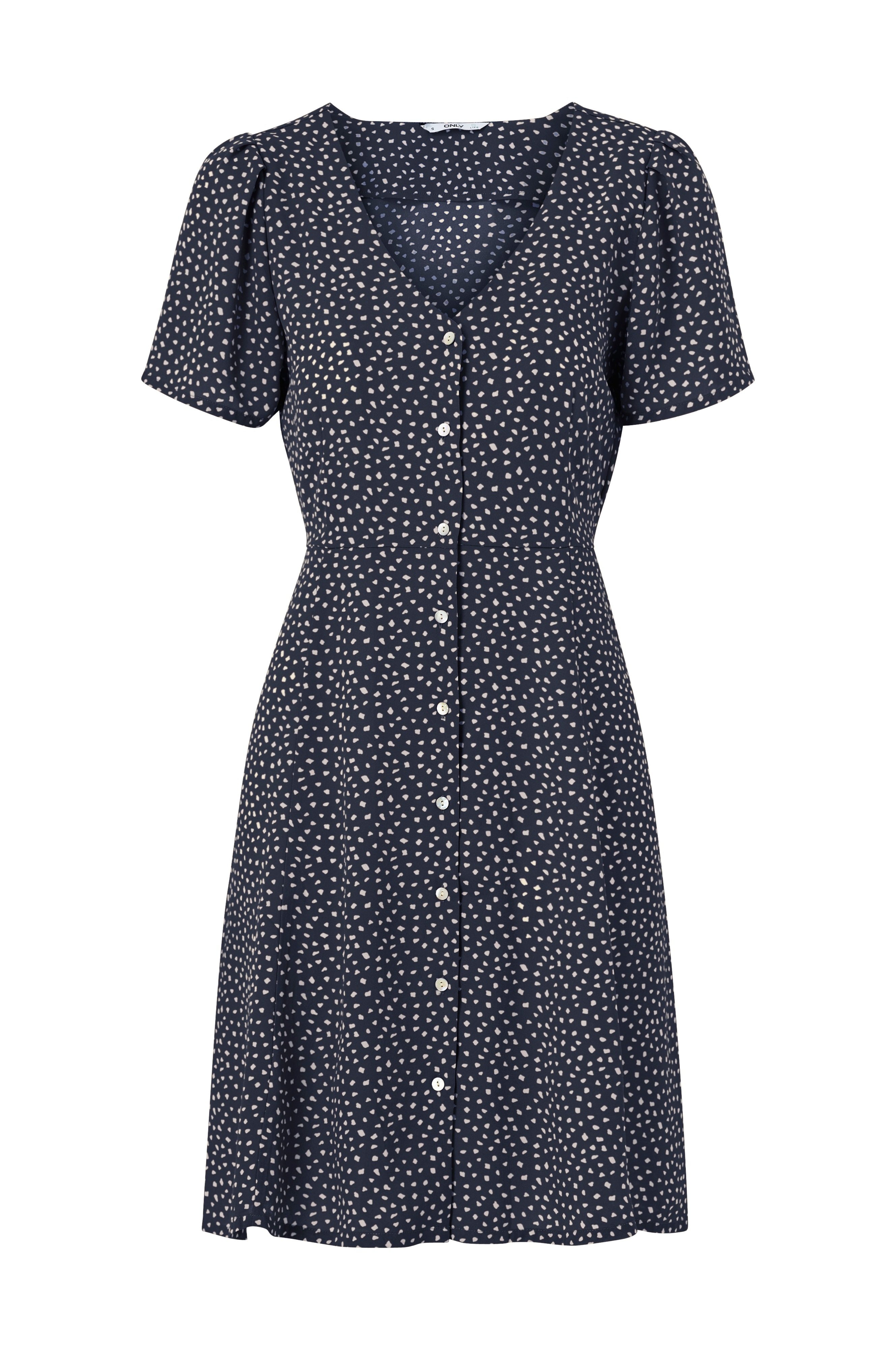 Nätt klänning med v-ringning och knappar fram, utställd kjol och korta ärmar med lagda veck på axlarna. Smalt knytband i sidorna. Gjord i vävd kvalitet. Längd ca 93 cm i stl 36.