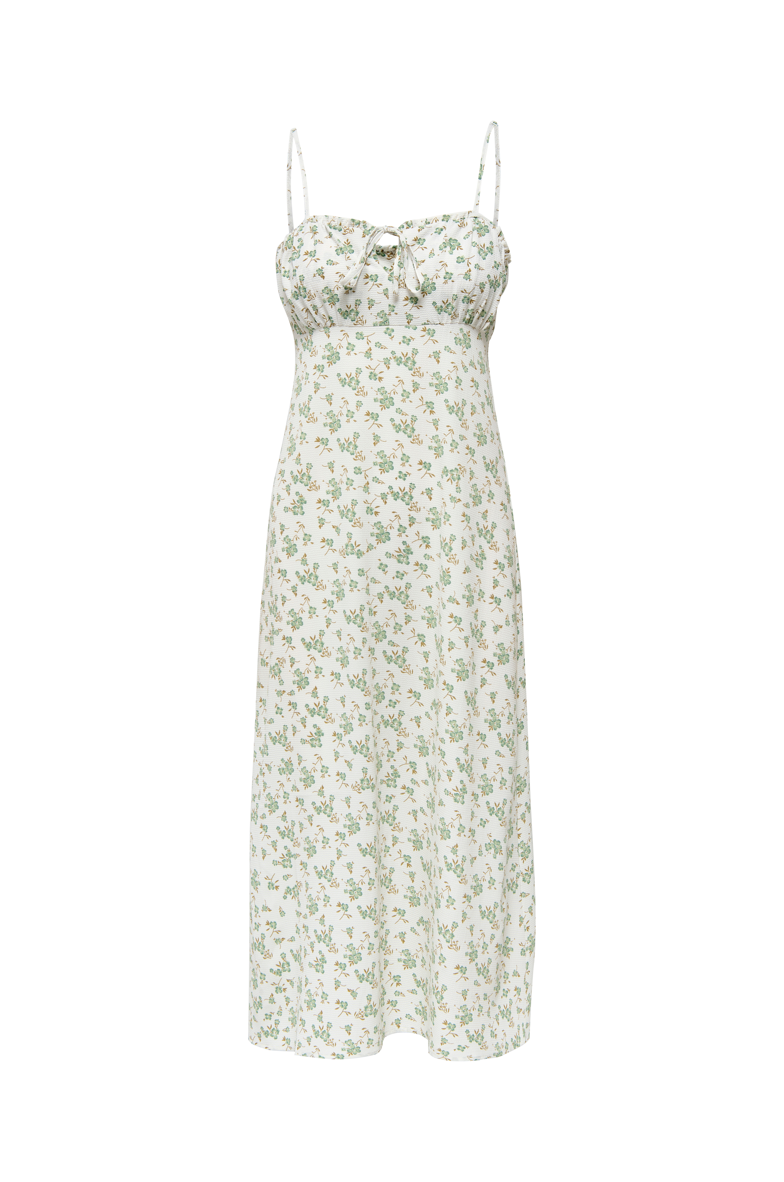 • Lång, mönstrad klänning • Kräppad kvalitet • Smala, justerbara axelband • Volangkant upptill • Sprund med knytband fram • Dold dragkedja bak • Längd: 130 cm i storlek S