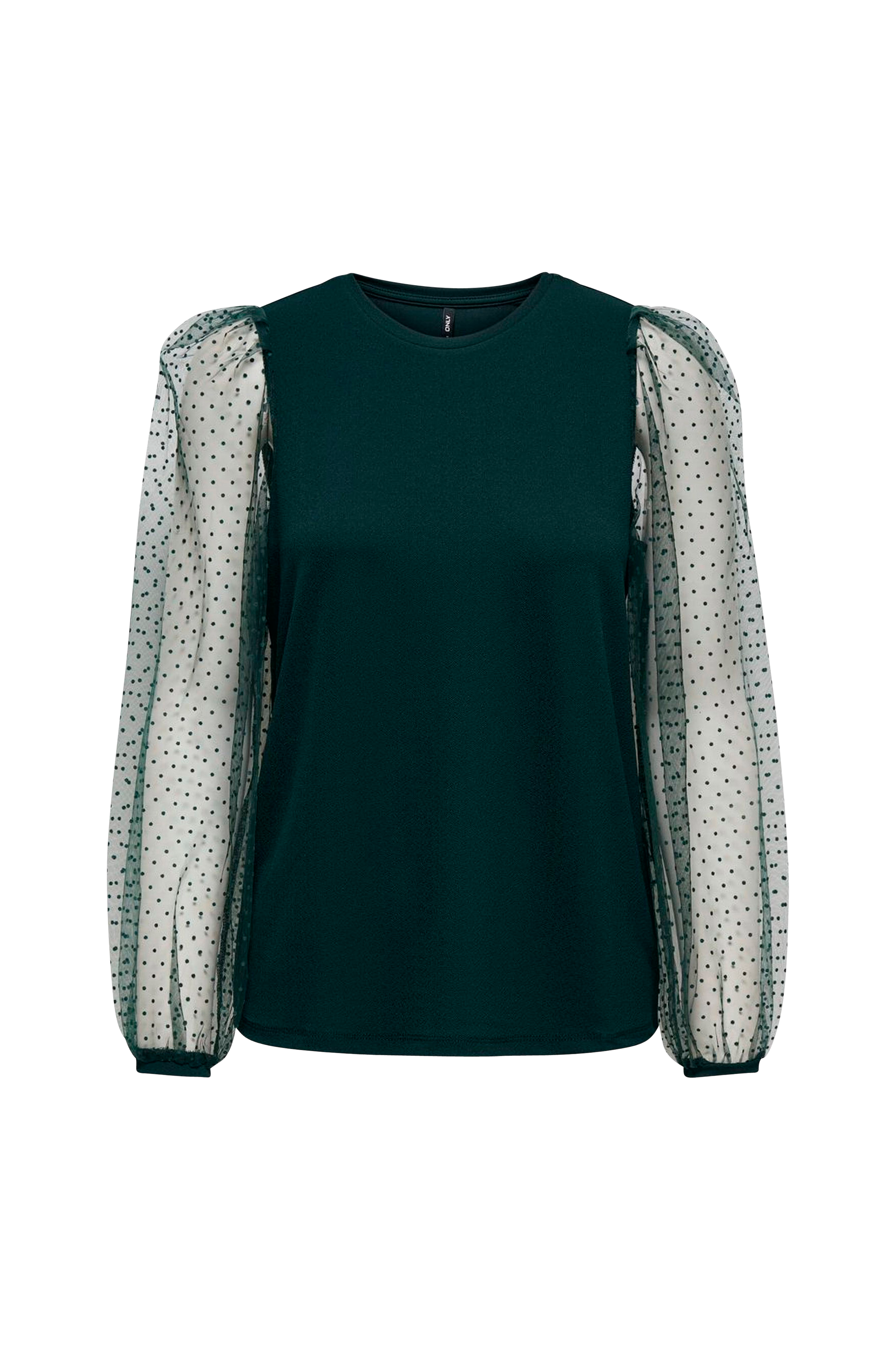 Topp onlMonna L/S Dot Top från Only. Rak modell i lätt glansig jerseykvalitet med vida puffärmar i chiffong som har vävda strukturprickar. Rund hals med liten, påsydd kant samt liten kant även i ärmslut.