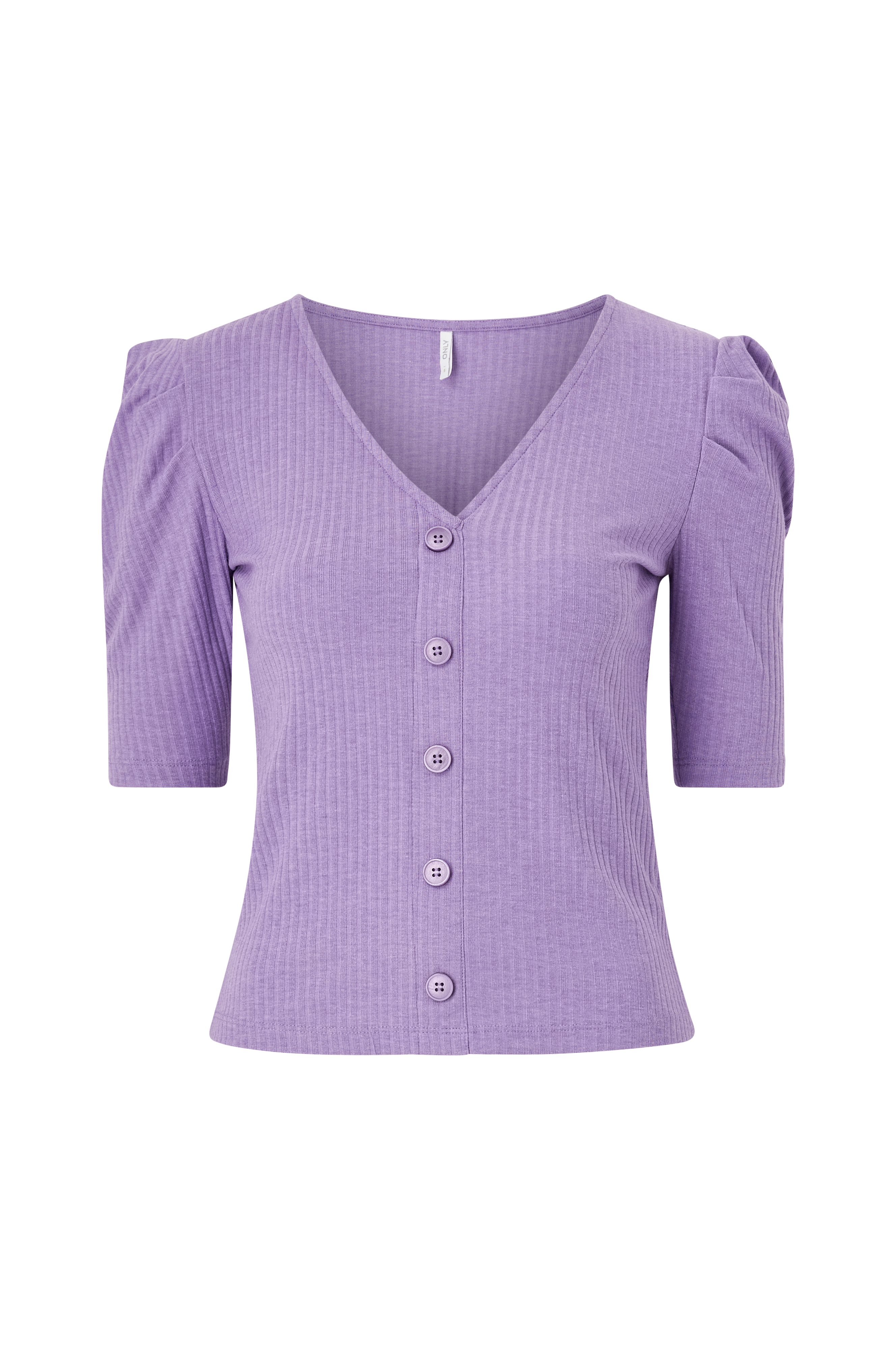 Ribbad topp i trikå med v-ringning och dekorknappar fram och halvlånga puffärmar med lagda veck på axlarna.