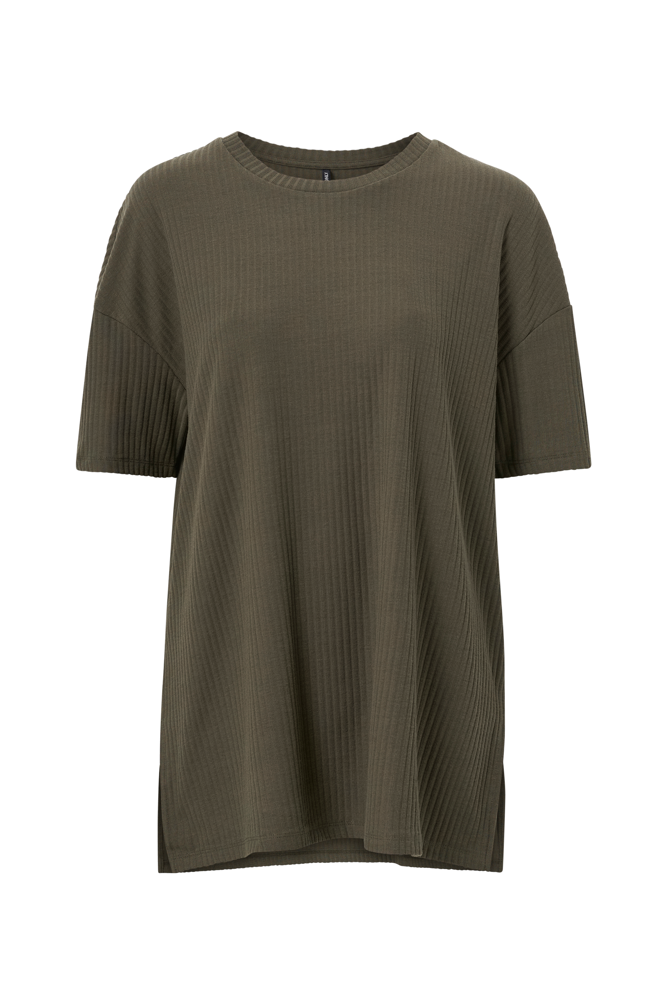 • Oversize fit • Kort ärm • Nerhasad axel • Slits i sidorna • Gjord av ribbad trikå • Produkten är certifierad enligt STANDARD 100 by OEKO-TEX®. Certifieringen garanterar att produkten är testad och fri från ämnen som kan vara skadliga för hälsan och miljön. Licensnummer & testinstitut: 97.T.1018 HOHENSTEIN HTTI