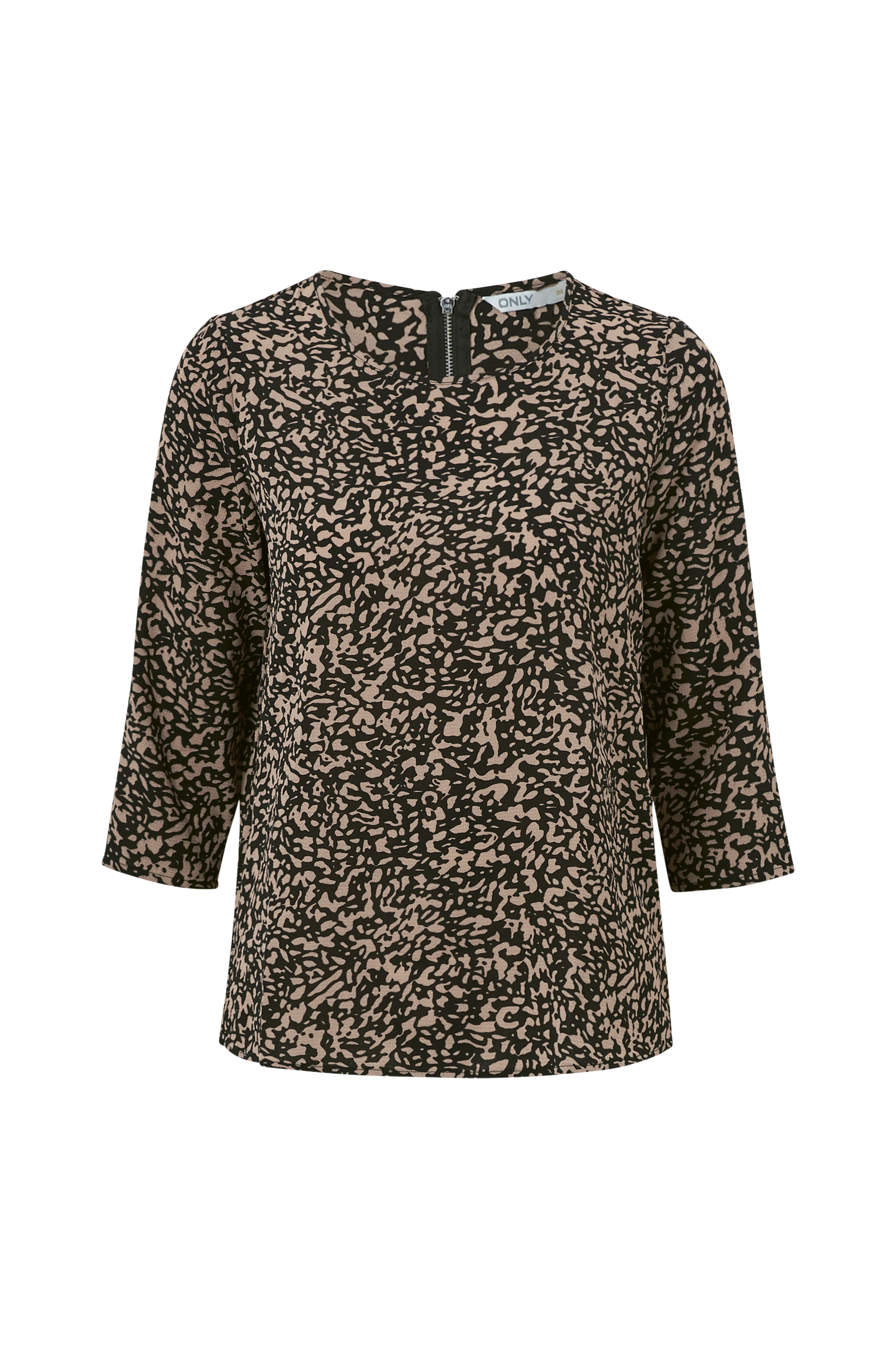 Topp i vävd kräppkvalitet med rak, 3/4-lång ärm. Rund hals med liten, påsydd kant och synlig dragkedja i nacken.