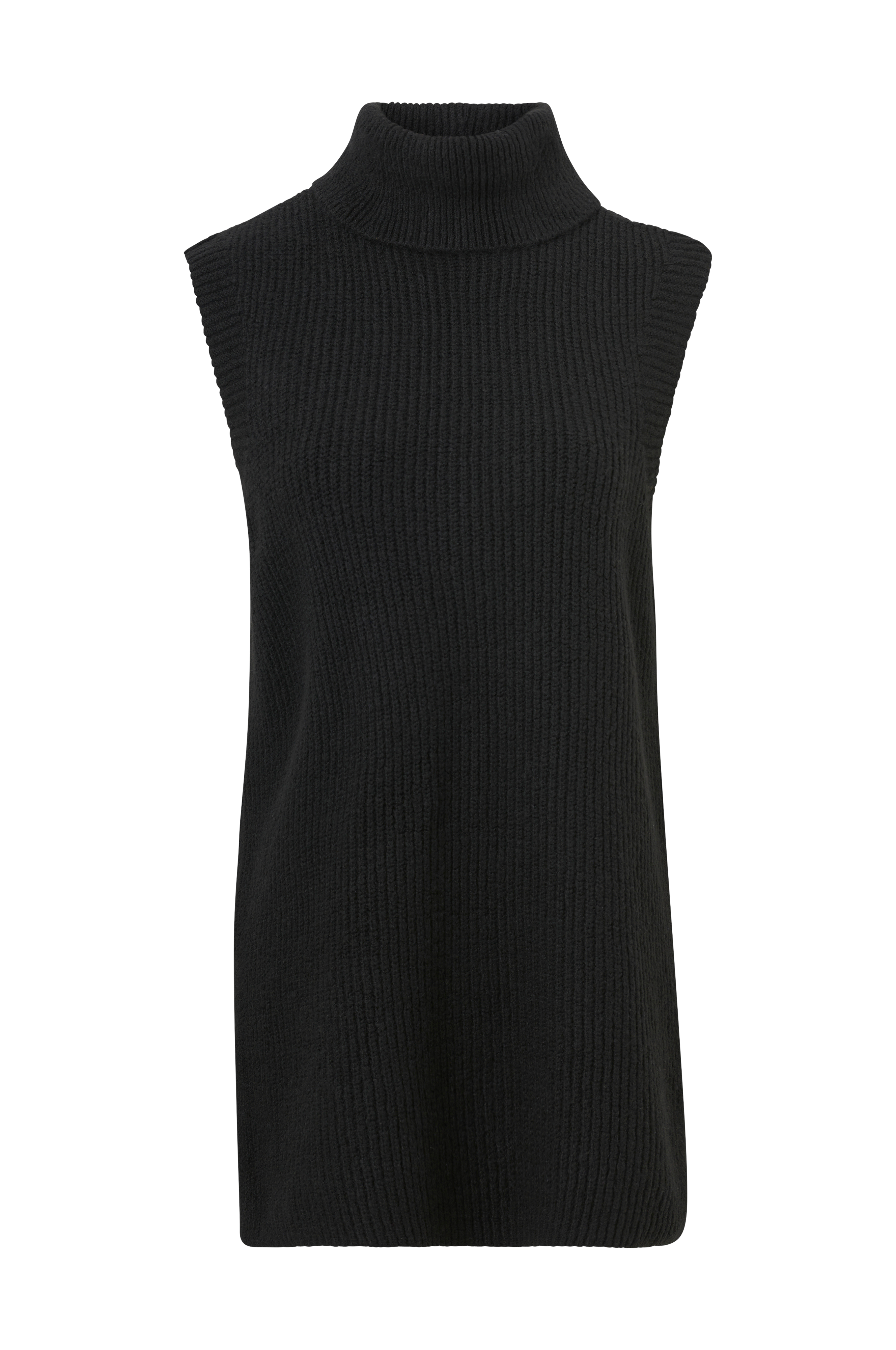 Stickad väst i längre modell med slitsar i sidorna och hög polokrage. Ribbstickade ärmöppningar.