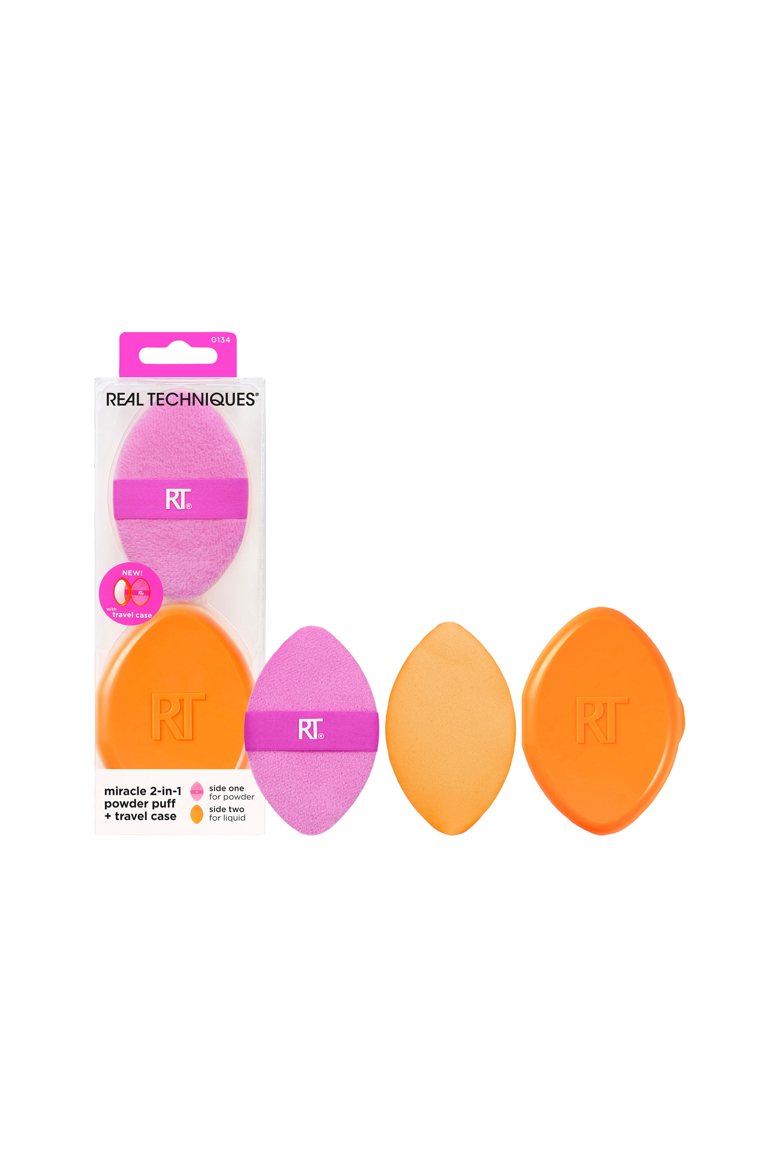 Real Techniques Miracle 2-in-1 Powder Puff + Travel Case innehåller vår mångsidiga, dubbelsidiga sminkpuff med ett reseetui för snabba touch-ups på språng.
