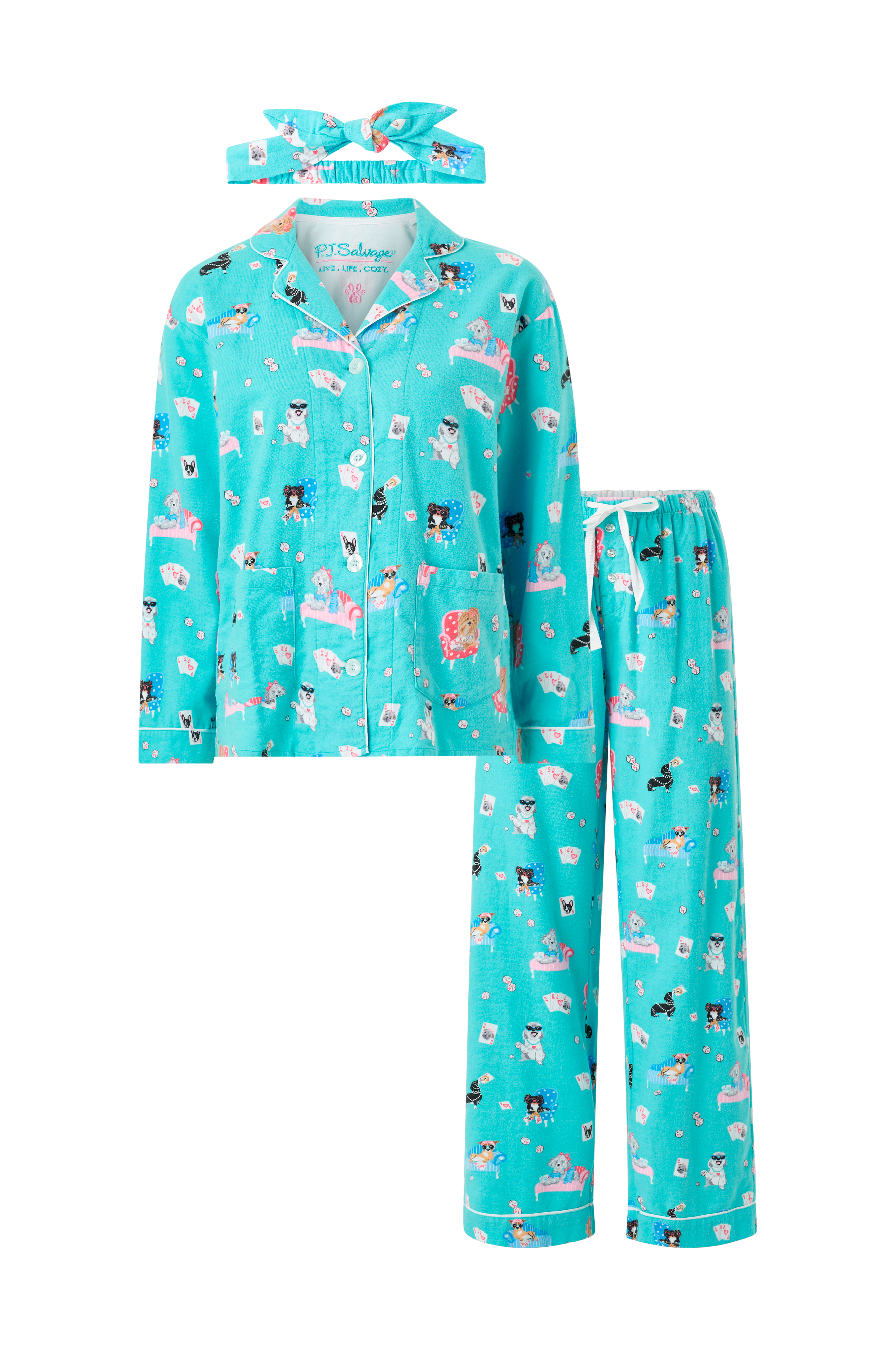 • 3-delat, mönstrat pyjamasset• Mjukt, mysigt material• Skjorta med krage, slag, knappstängning och två fickor• Byxor med elastisk midja, dragsko och knappstängning• Hårband med knytdetalj