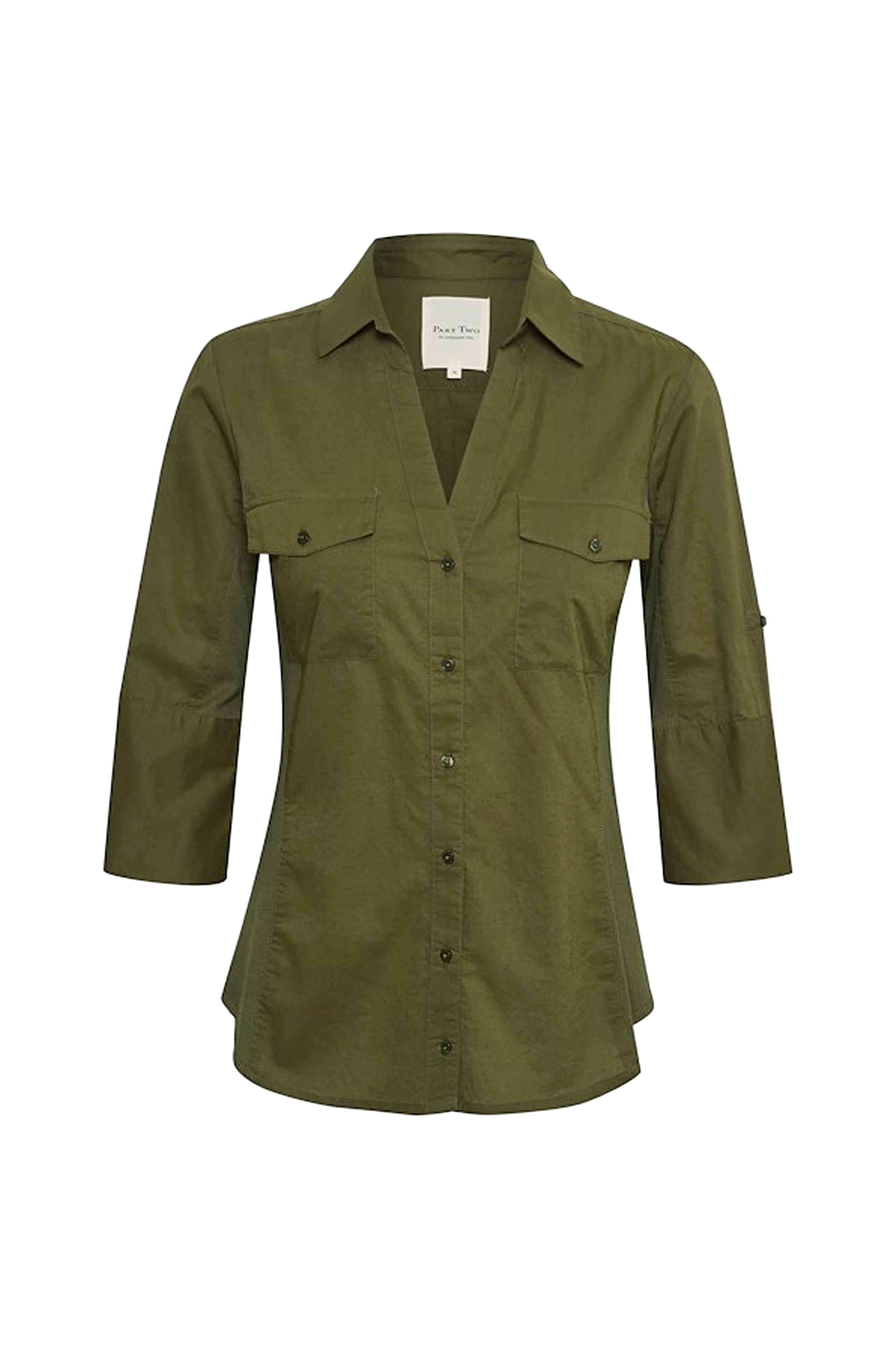 Lätt figurformad modell i vävd kvalitet med infällning av ribbstickad trikå i sidorna samt på undersida ärm. Liten krage och v-ringning fram som övergår i knappslå. Halvlång ärm med invändig tamp för uppvik samt rundskuren nederkant.