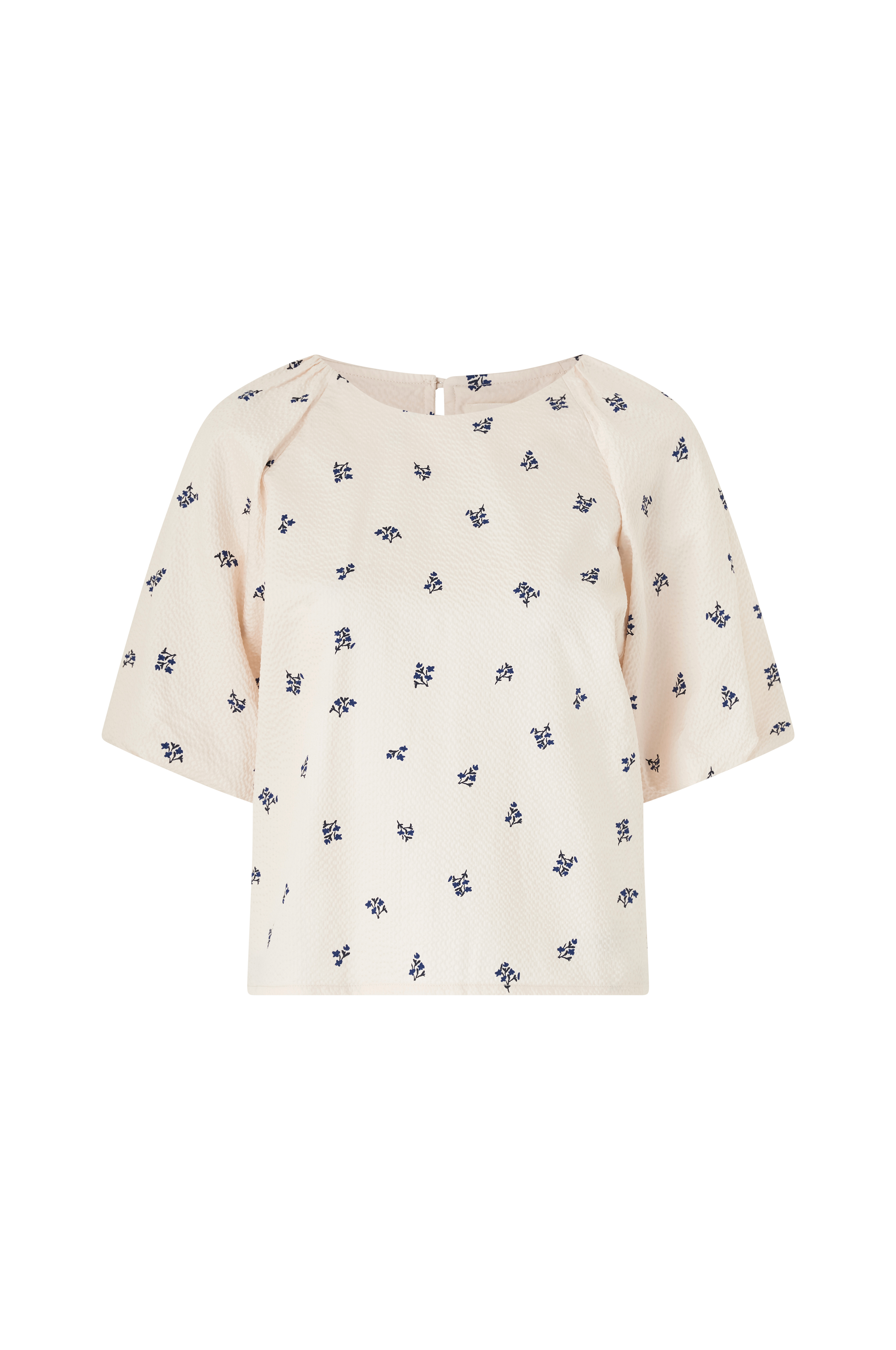 • Korta puffärmar• Sprund med knapp i nacken• Strukturerat material