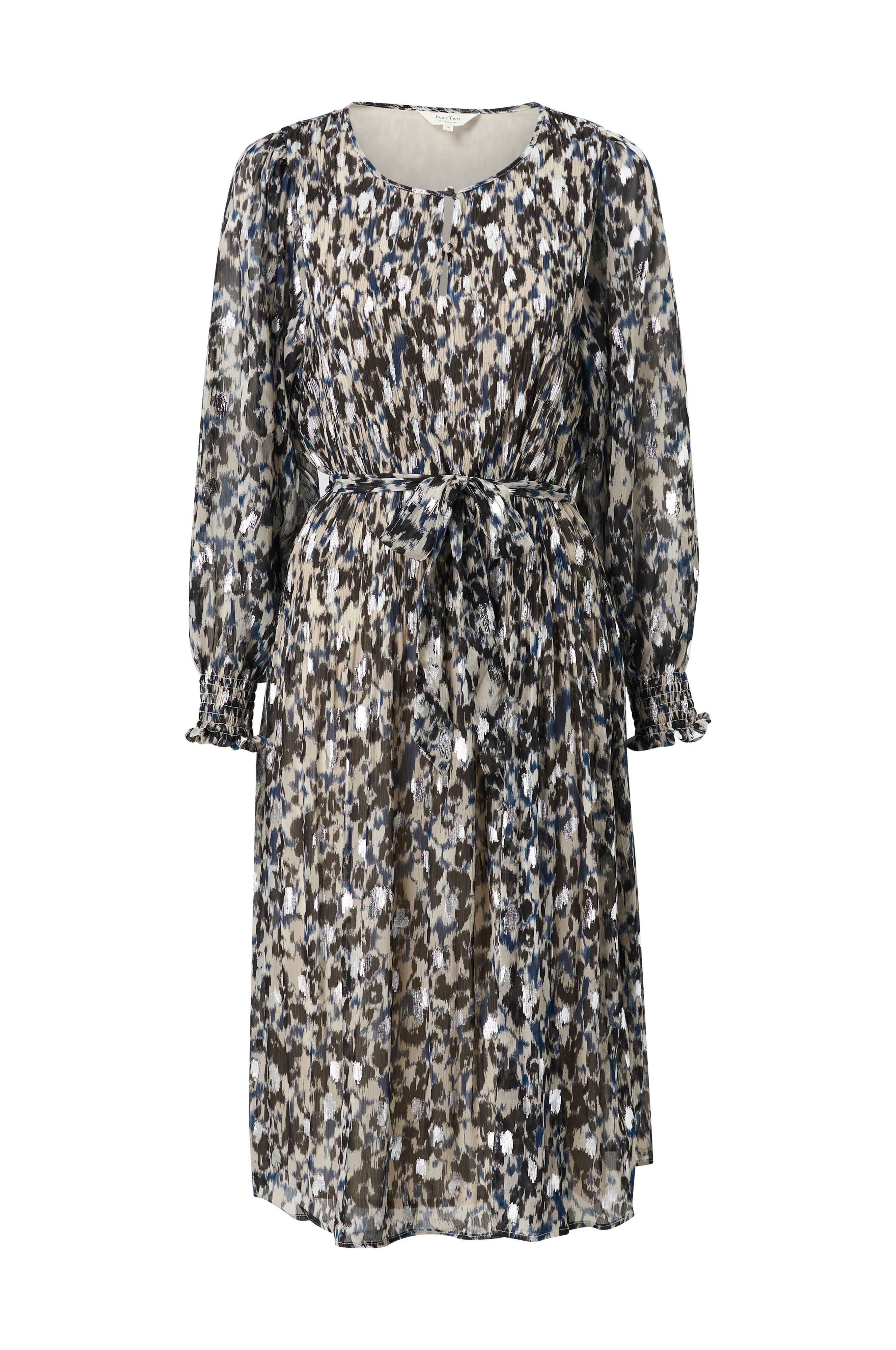 • Utsvängd modell • Rund hals med sprund och knappar fram • Ballongärmar med smock i ärmsluten • Knytskärp i midjan • Gjord av plisserad chiffong med silvrigt mönster • Fodrad • Längd: 111 cm i storlek 36 • Produkten innehåller återvunnet material som har tagits tillvara för att minska mängden avfall, samtidigt som nya resurser inte har förbrukats.