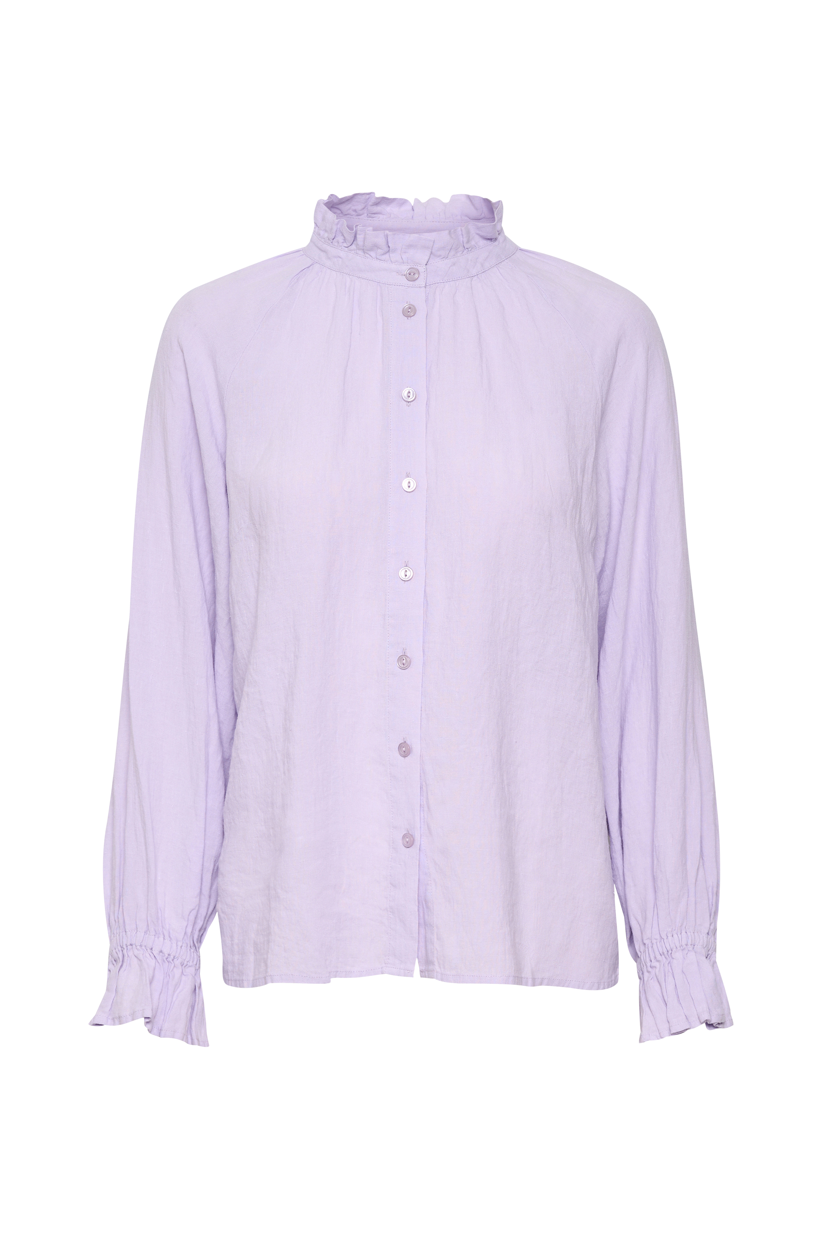 Rak modell med ledig form i vävd linnekvalitet. Vid, raglanskuren ärm med infälld resår nertill. Rund hals med påsydd volangkant och knäppning hela vägen fram.