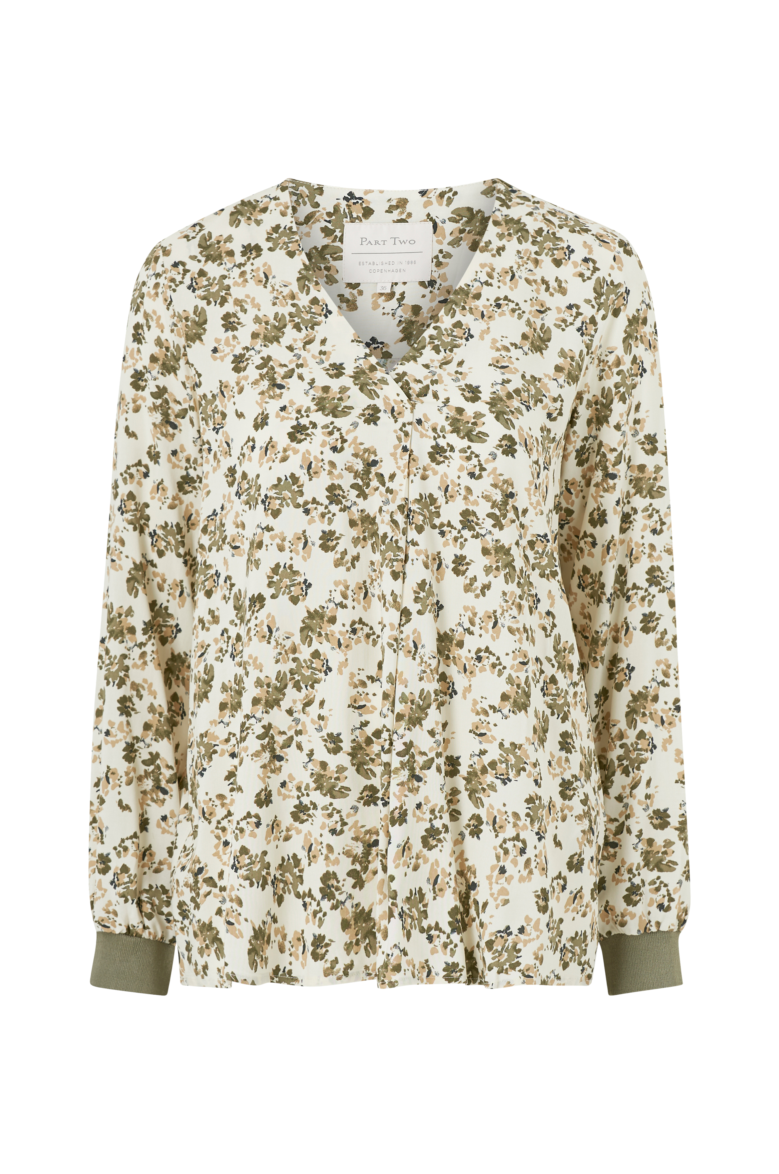 Rak modell med v-ringad hals och stort lagt veck på bröstet. Avskuret axelok bak och lång ärm med ribbstickad mudd i ärmslut.
