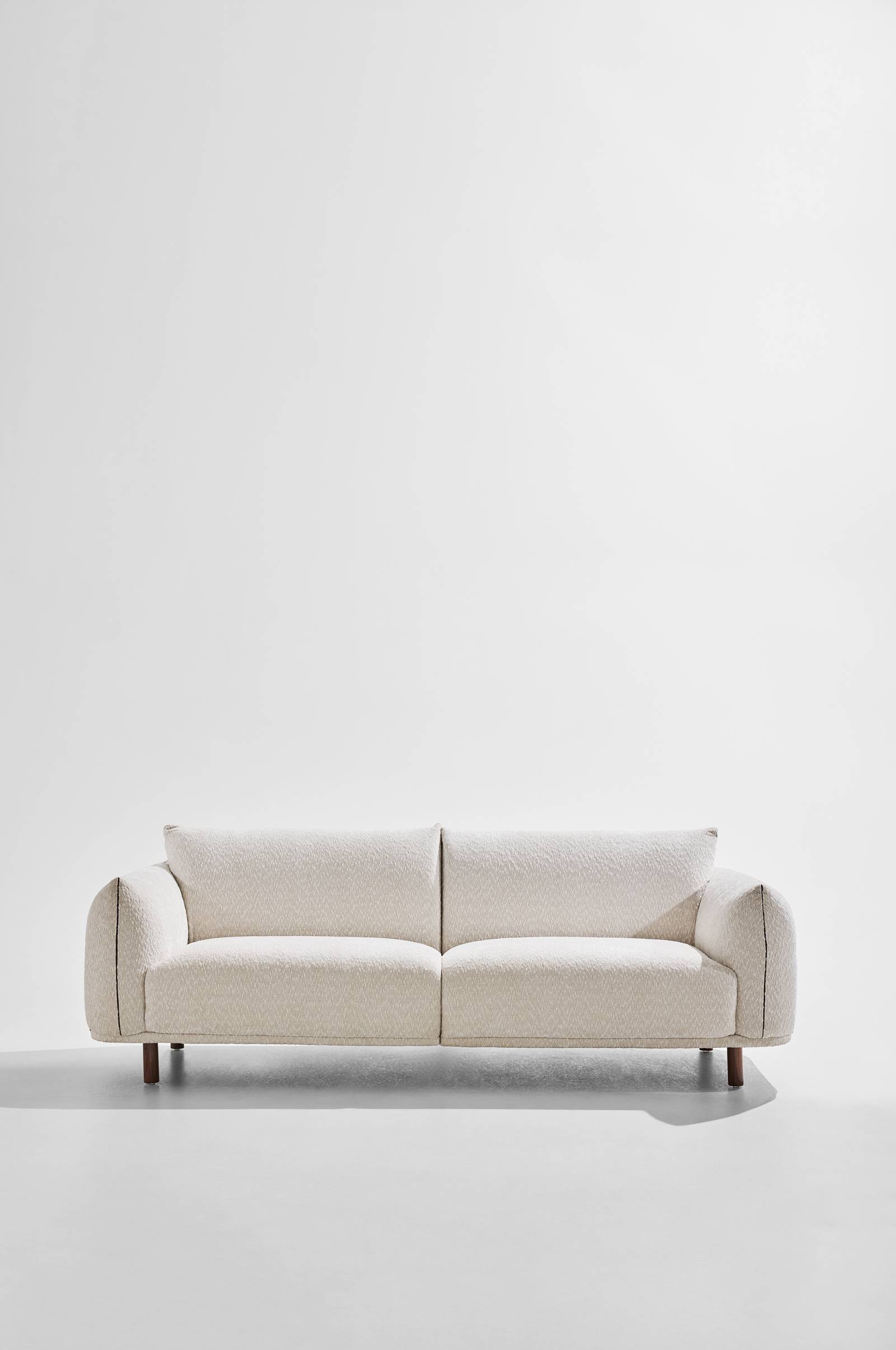 Sitt- och ryggkuddarna skapar en inbjudande kontrast till den blanka träytan, medan omsorgsfullt utformade detaljer förstärker den övergripande känslan av förfining. Soffans proportioner är omsorgsfullt balanserade för att erbjuda både komfort och en elegant visuell närvaro.