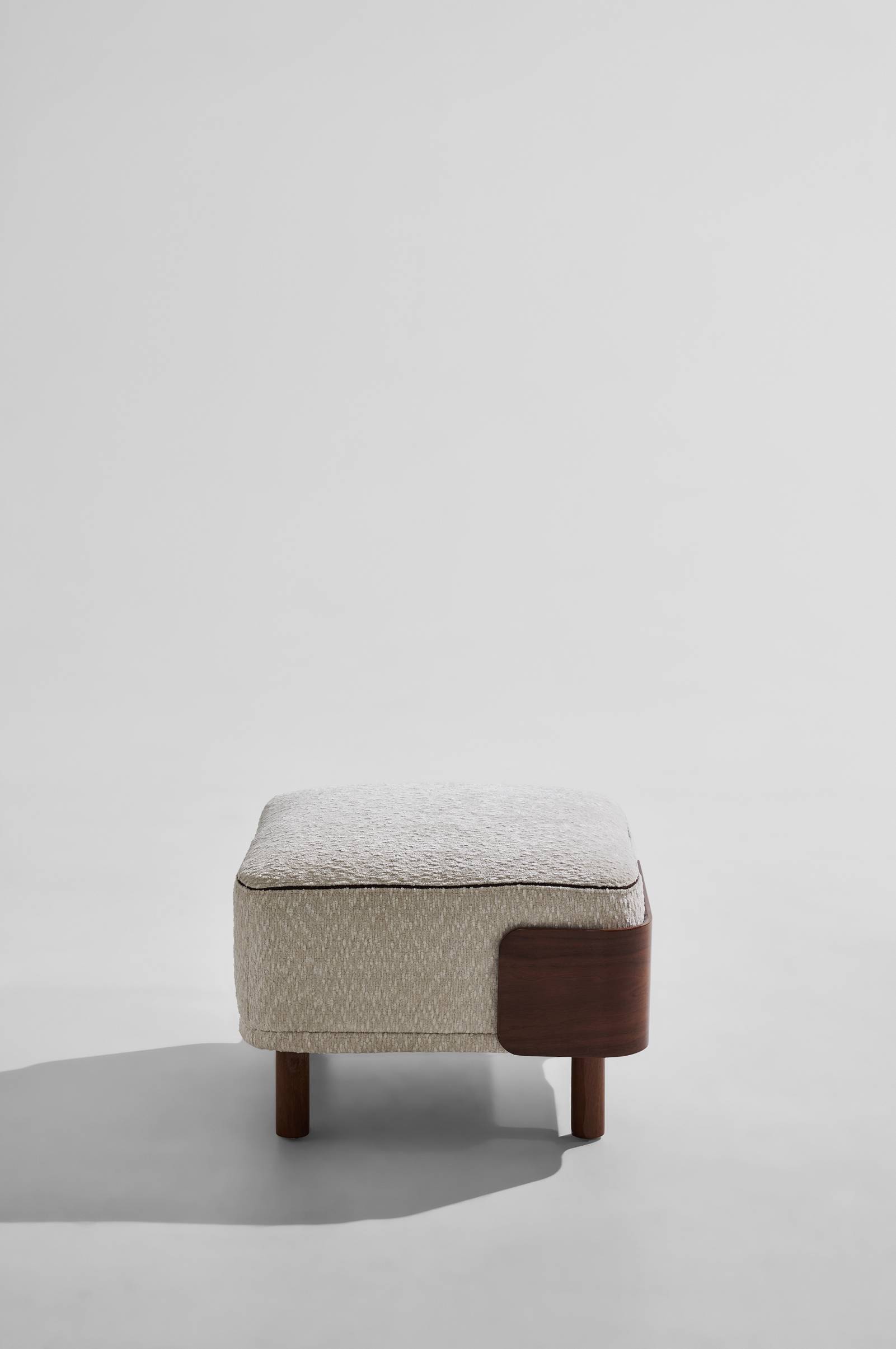 Denna sittpuff från Pastill definieras av ett distinkt formspråk där material och detaljer står i centrum. Den skulpturala ramen i högglansig valnötsfanér ger ottomanen ett exklusivt uttryck, vilket gör den till ett sofistikerat tillskott oavsett om den används som en fristående möbel eller tillsammans med Barry-kollektionen.