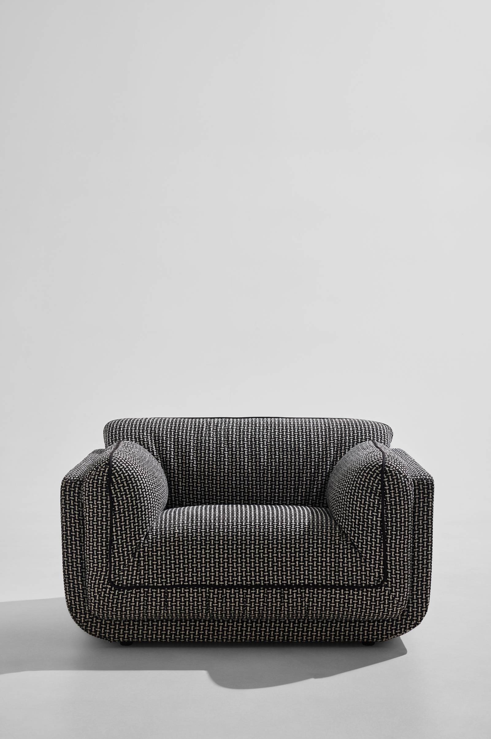 Den helklädda formen skapar en harmonisk helhet, medan det texturerade tyget ger karaktär och en behaglig taktil känsla. Mjukt rundade armstöd och en generöst tilltagen sits ger en skön komfort - perfekt för avkoppling, läsning eller lugna stunder.
