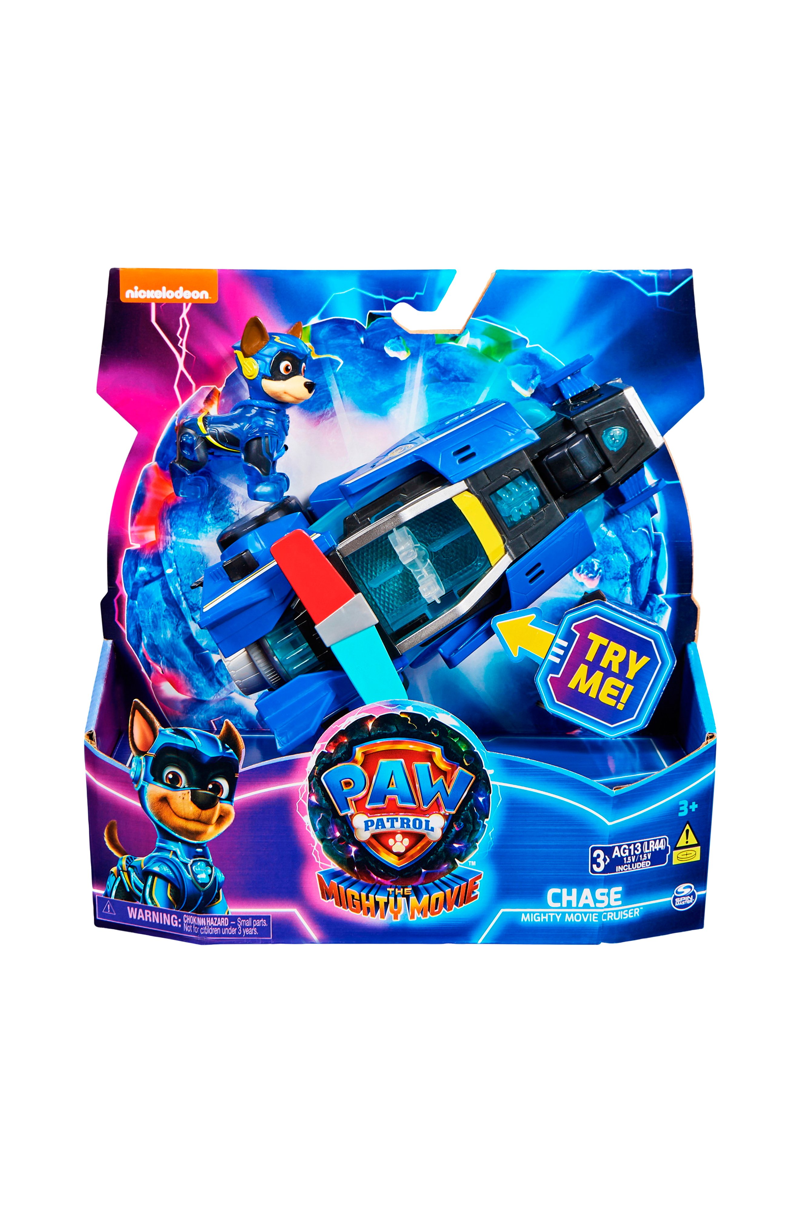 Åk på spännande räddningsuppdrag med Chase som har en cool hjälm.Sätt Chase på sätet i polisbilen och aktivera belysningen i fordonet samt se hans tassar lysa upp.