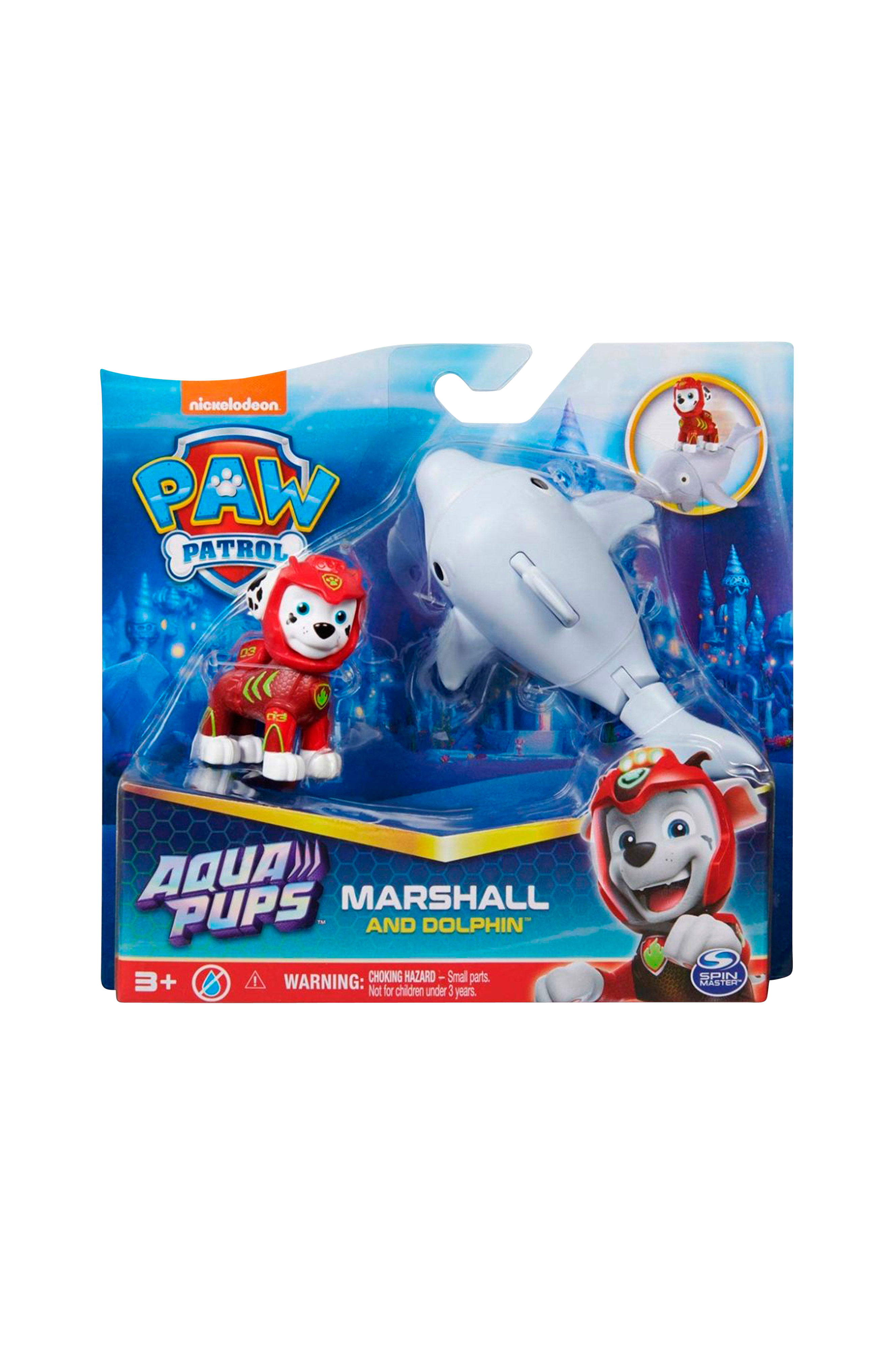 Actionfigurset som innehåller Marshall i hans nya våtdräktsuniform och hans pålitliga delfinkompis! Den älskade valpen från PAW Patrol är redo att ge sig ut i action! Fäst Marshall på delfinens ryggfena och rulla delfinen framåt för att aktivera hans guppande stjärtfena när du skyndar till räddning och räddar dagen!
