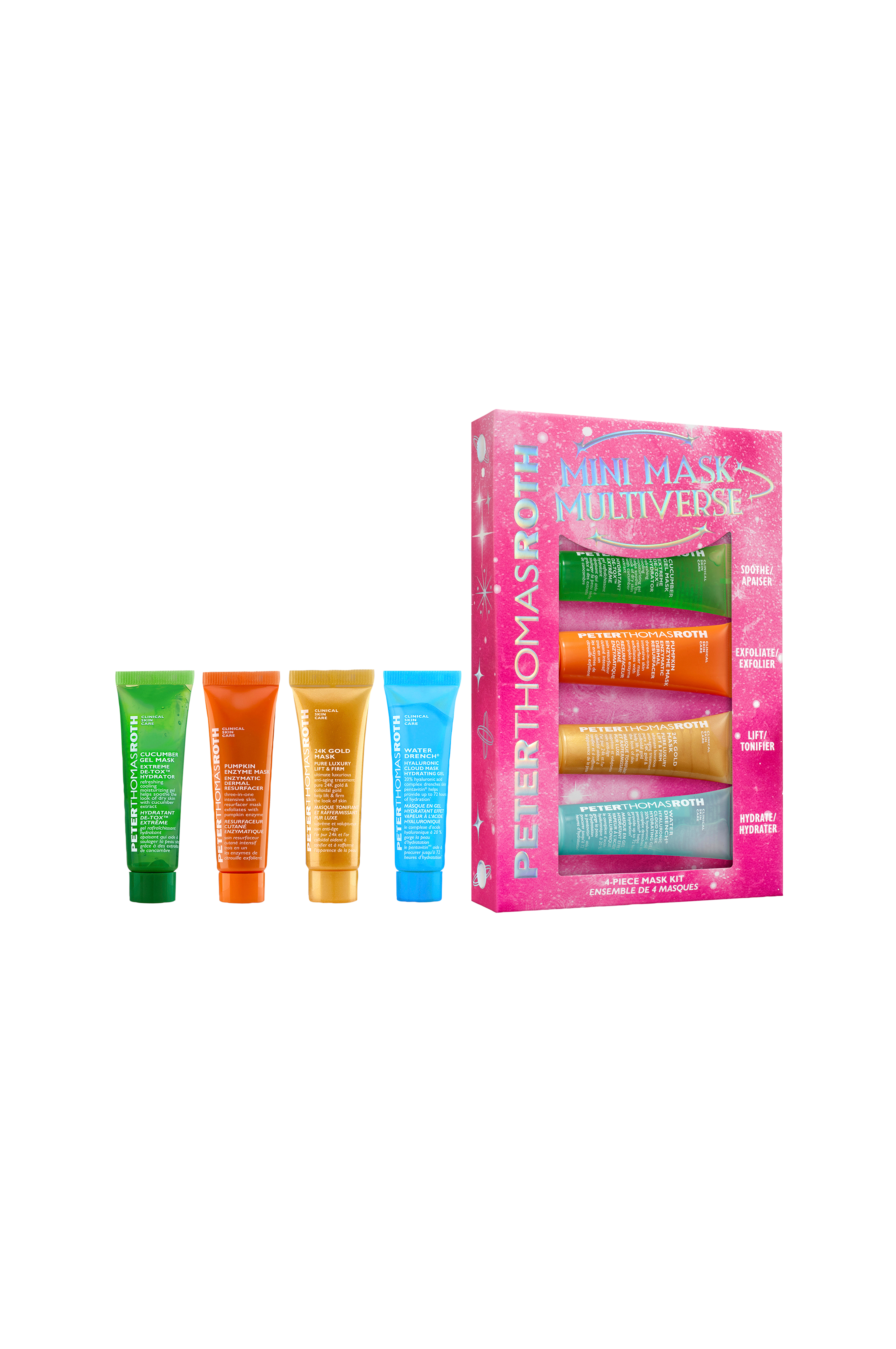 "Mini Mask Multiverse - ett set med fyra mini masker så att du kan utforska Peter Thomas Roths berömda hudvård och få en hud som känns lugn, len, glödande och återfuktad. Multi-mask på språng och tillgodose hudens olika behov med Cucumber Gel Mask Extreme De-Tox ™ Hydrator, Pumpkin Enzyme Mask Enzymatic Dermal Resurfacer, 24K Gold Mask Pure Luxury Lift & Firm och Water Drench® Hyaluronic Cloud Mask Hydrating Gel i mini storlek!