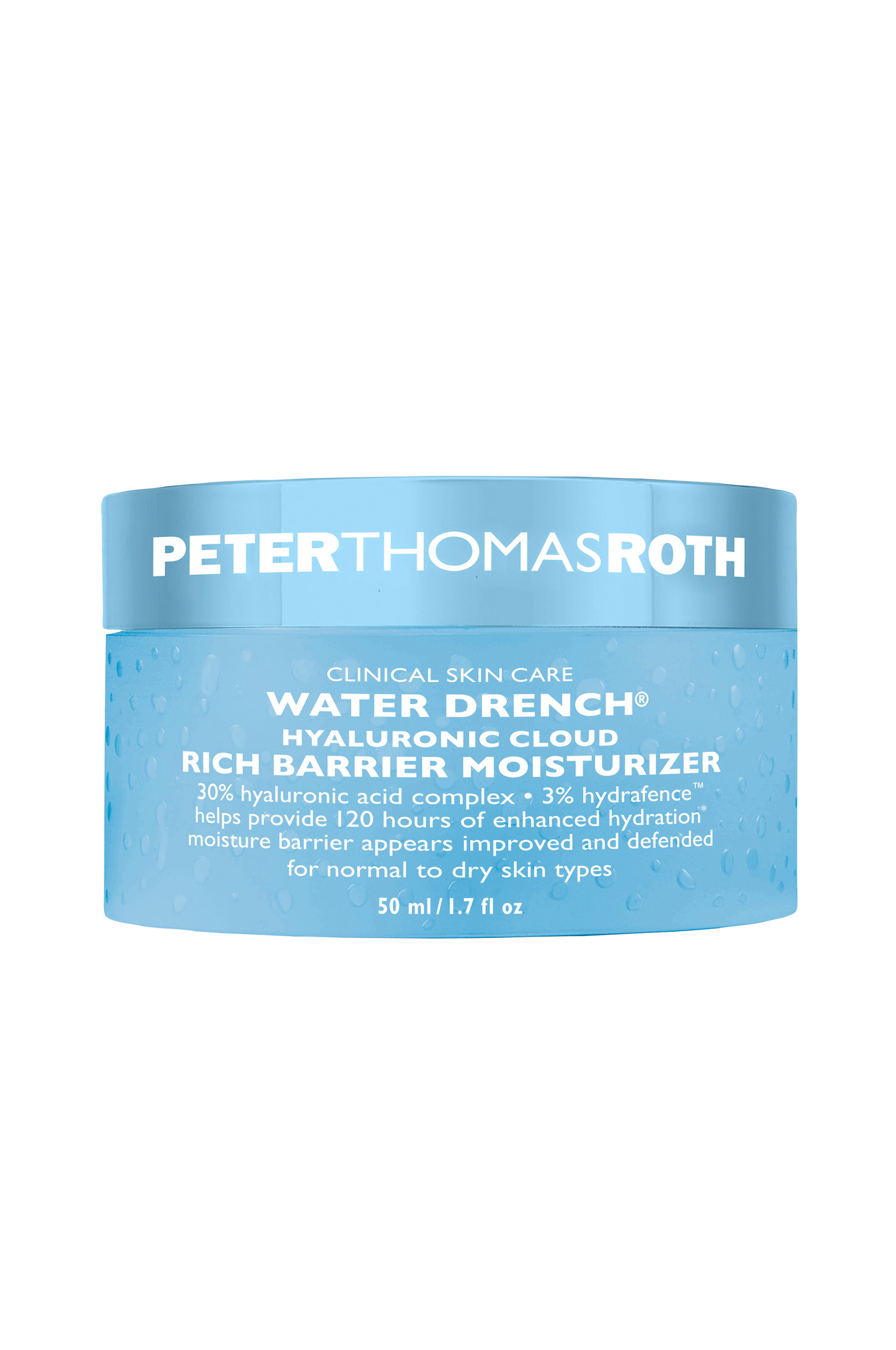 Peter Thomas Roth Water Drench® Hyaluronic Cloud Rich Barrier Moisturizer dränker huden i ett rikt moln av skyddande fukt och lämnar huden med en hälsosam, ungdomlig lyster. Formulan är framtagen för att stärka hudbarriären och skydda mot uttorkande yttre faktorer. Ett innovativt Moisture Barrier Boosting Complex™ hjälper till att bekämpa de uttorkande effekterna av yttre stressfaktorer samtidigt som det förbättrar hudens fyllighet, fasthet och elasticitet. Fuktighetskrämen innehåller ett 30% hyaluronsyrakomplex som drar in vatten och hjälper till att fylla huden med fukt, medan 2% BioWave hjälper till att förbättra hudens naturliga fuktbalans och förhindra framtida fuktförlust. 3% HydraFence™ ger upp till 120 timmars förbättrad återfuktning*. Uppkomsten av torrhet, fina linjer och rynkor reduceras synligt, vilket gör att huden ser friskare och mer motståndskraftig ut. Doftfri.