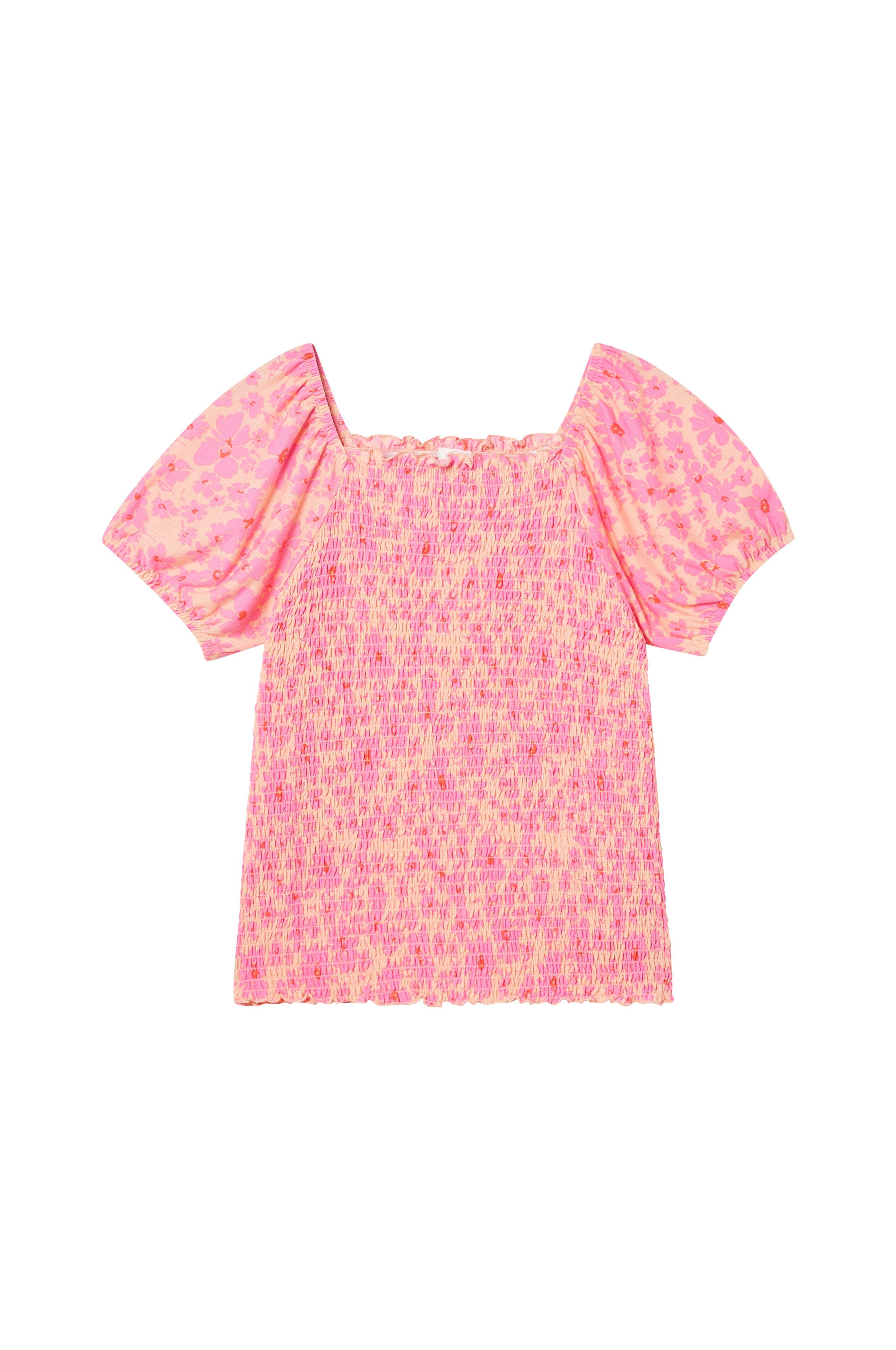 • Smockad topp• Fyrkantig halsringning• Korta ärmar med resår i ärmsluten