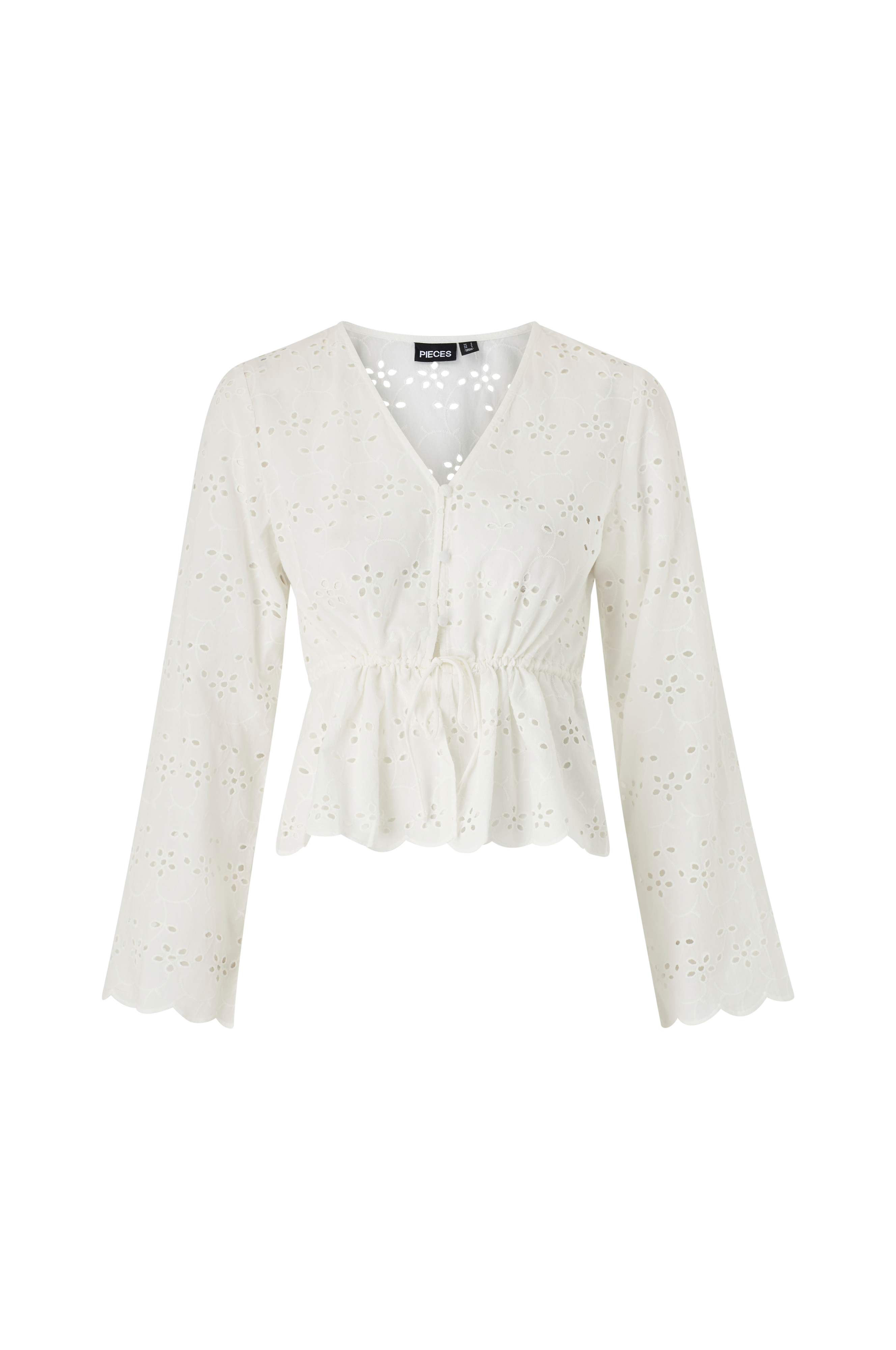 • Modell med hålbroderier• V-ringad hals• Ögleknäppning med klädda knappar• Dragsko i midjan• Lång, utsvängd ärm
