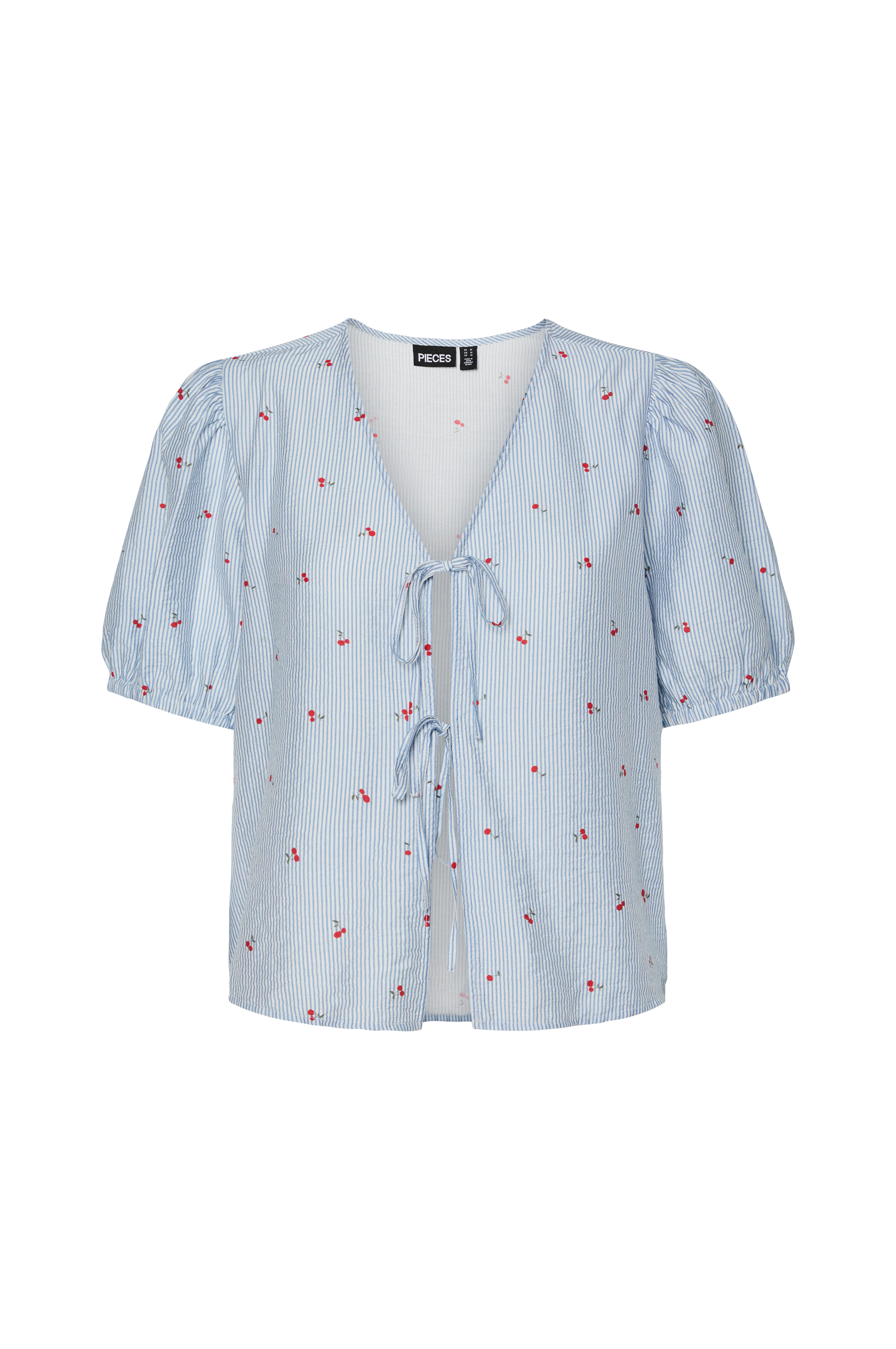 • Blus med korta puffärmar och resår i ärmsluten• V-ringad hals• Knytband fram