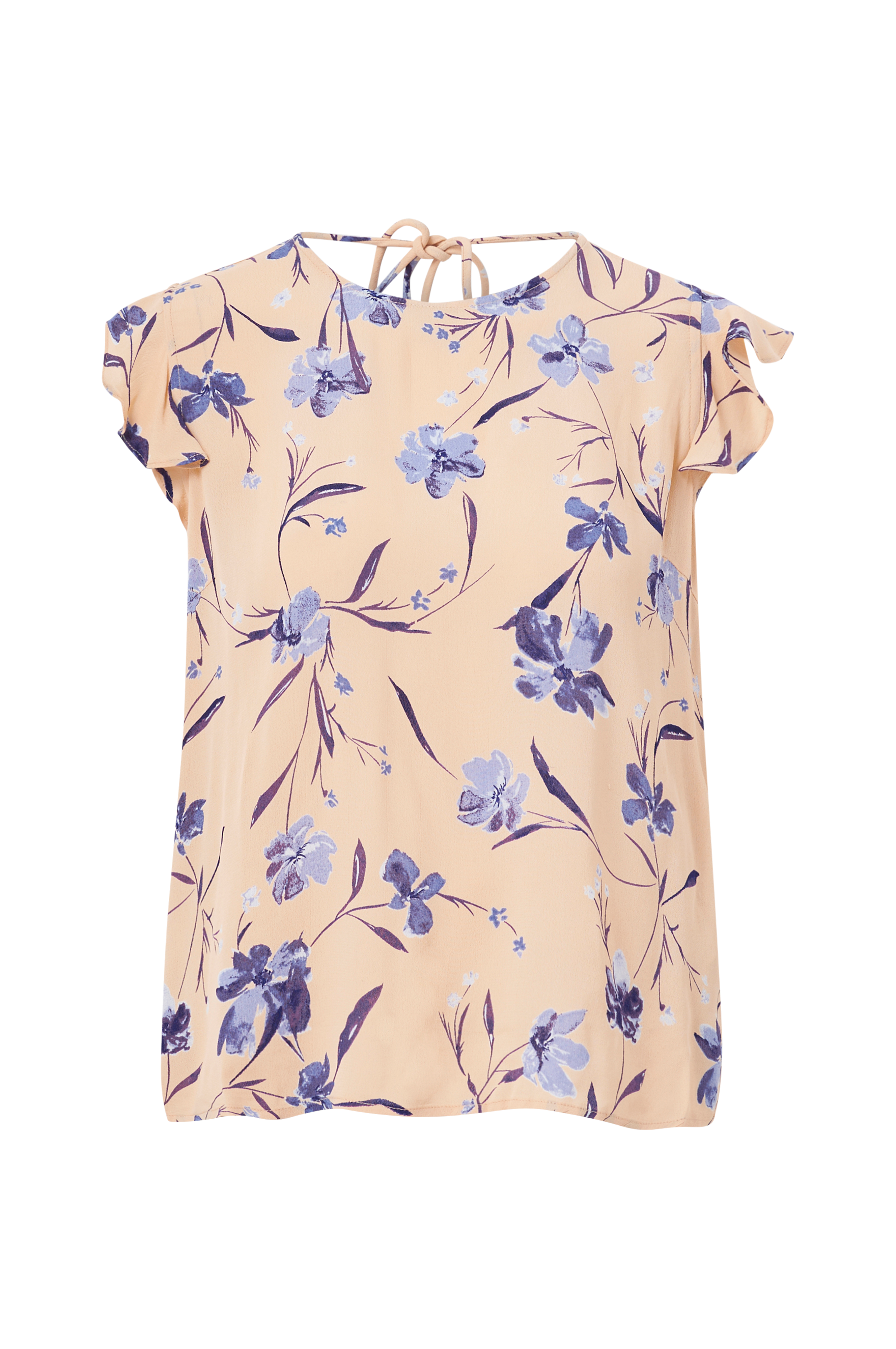 • Kort volangärm• Rund hals fram• V-ringning med knytband bak