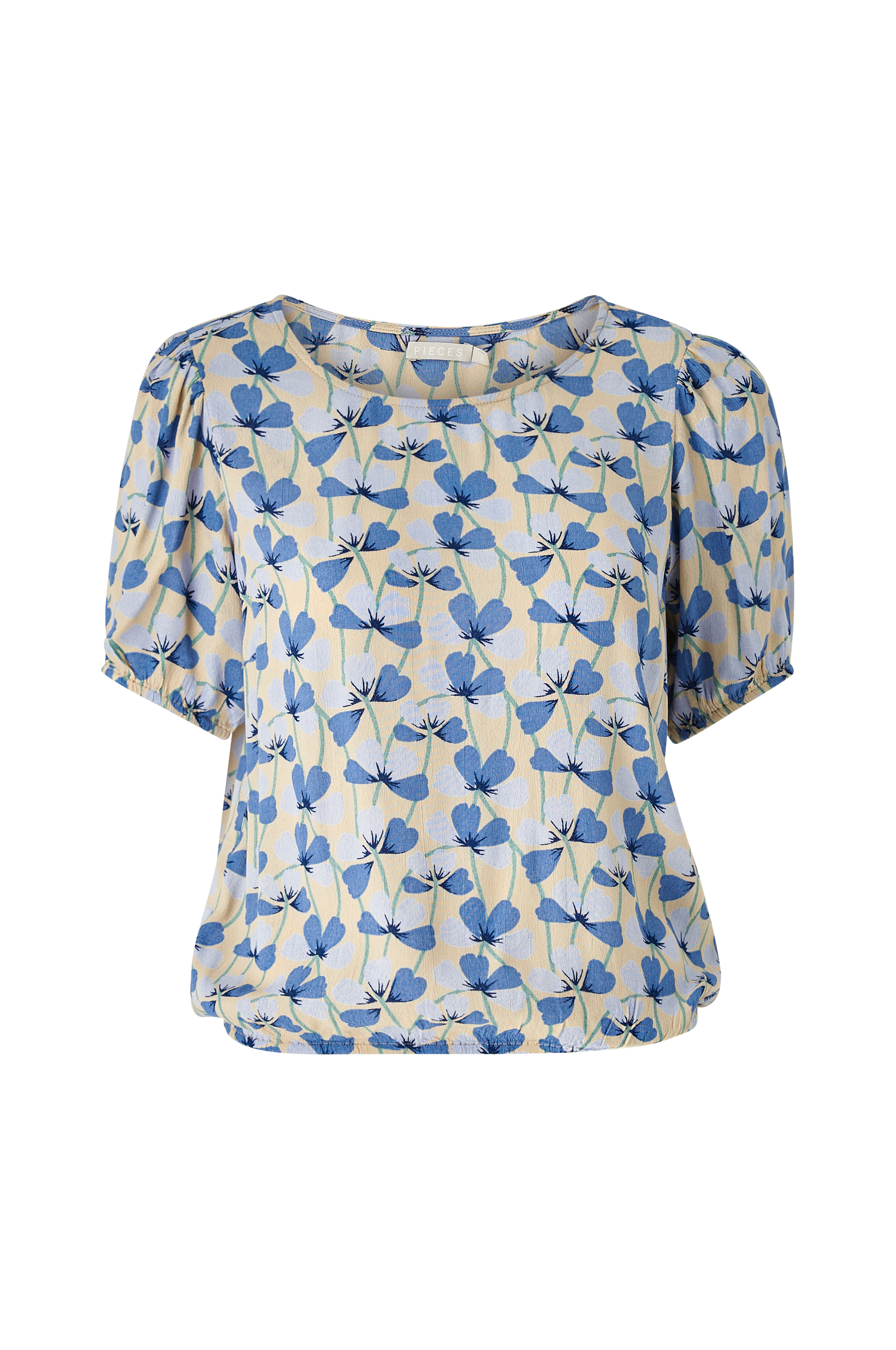 Blus pcViva SS Top från Pieces i vävd viskos med vackert mönster. Korta ärmar med rynkad axelsöm och elastiska ärmslut. Resår i nederkant.