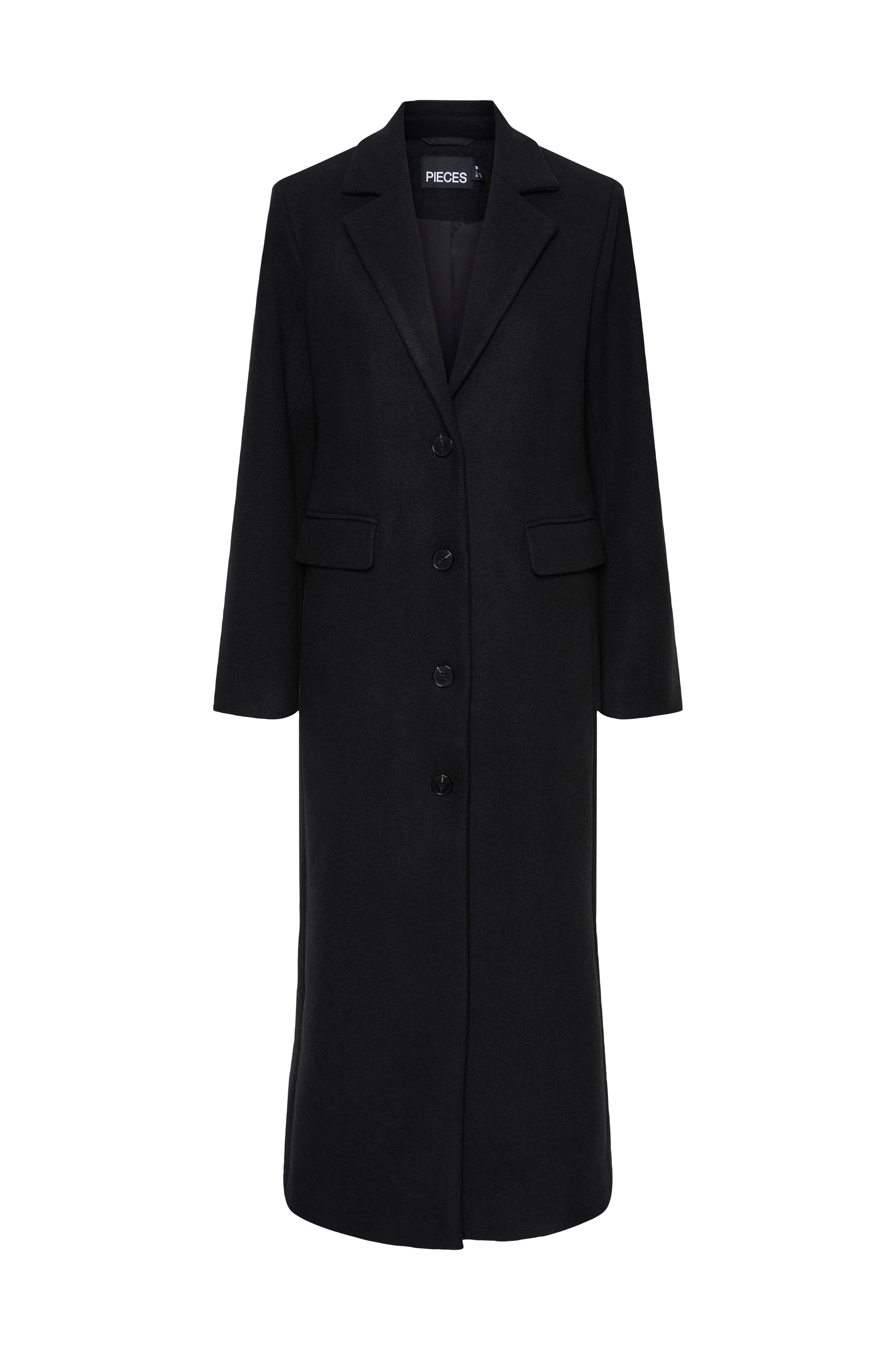 • Lång, klassisk kappa med krage och slag