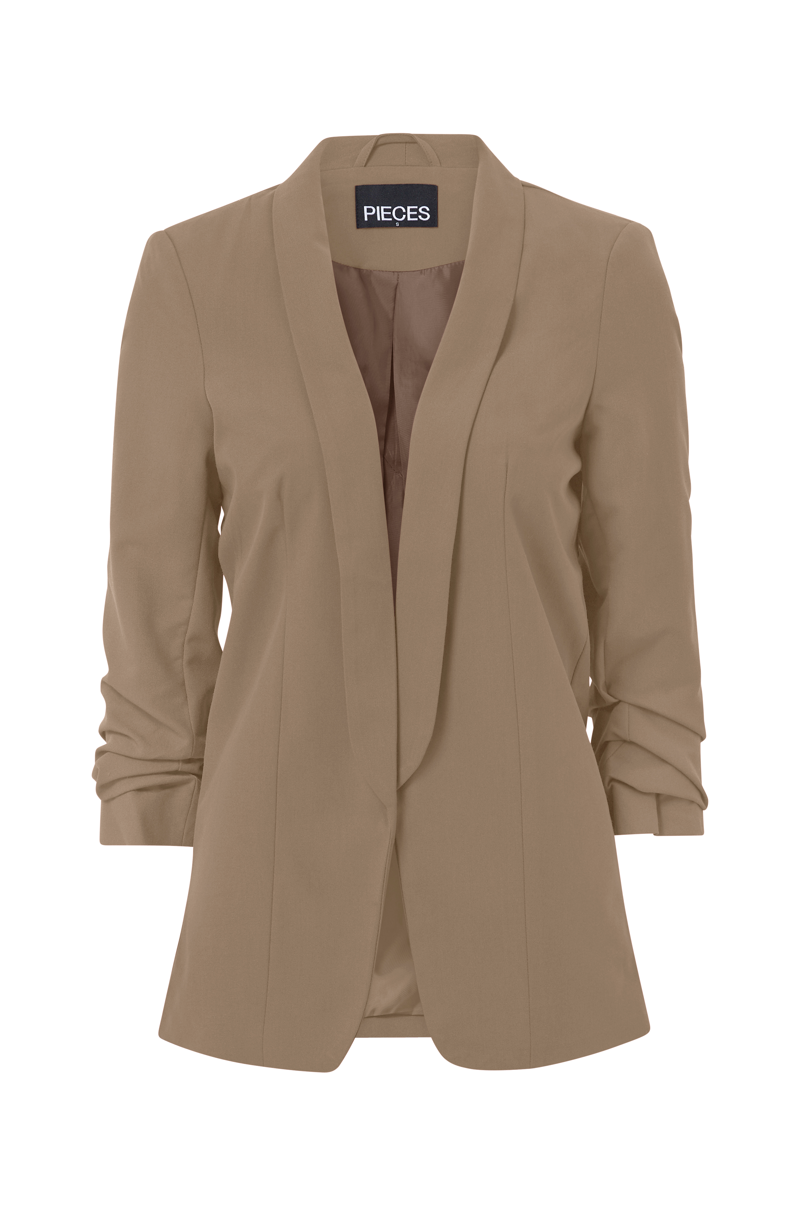 Kavaj pcBoss 3/4 Blazer från Pieces i öppen modell med sjalkrage och 3/4-långa ärmar med rynkad nederdel. Tunna axelvaddar ger fin passform. Gjord i vävd kvalitet med lätt stretch och tunt, vävt foder.