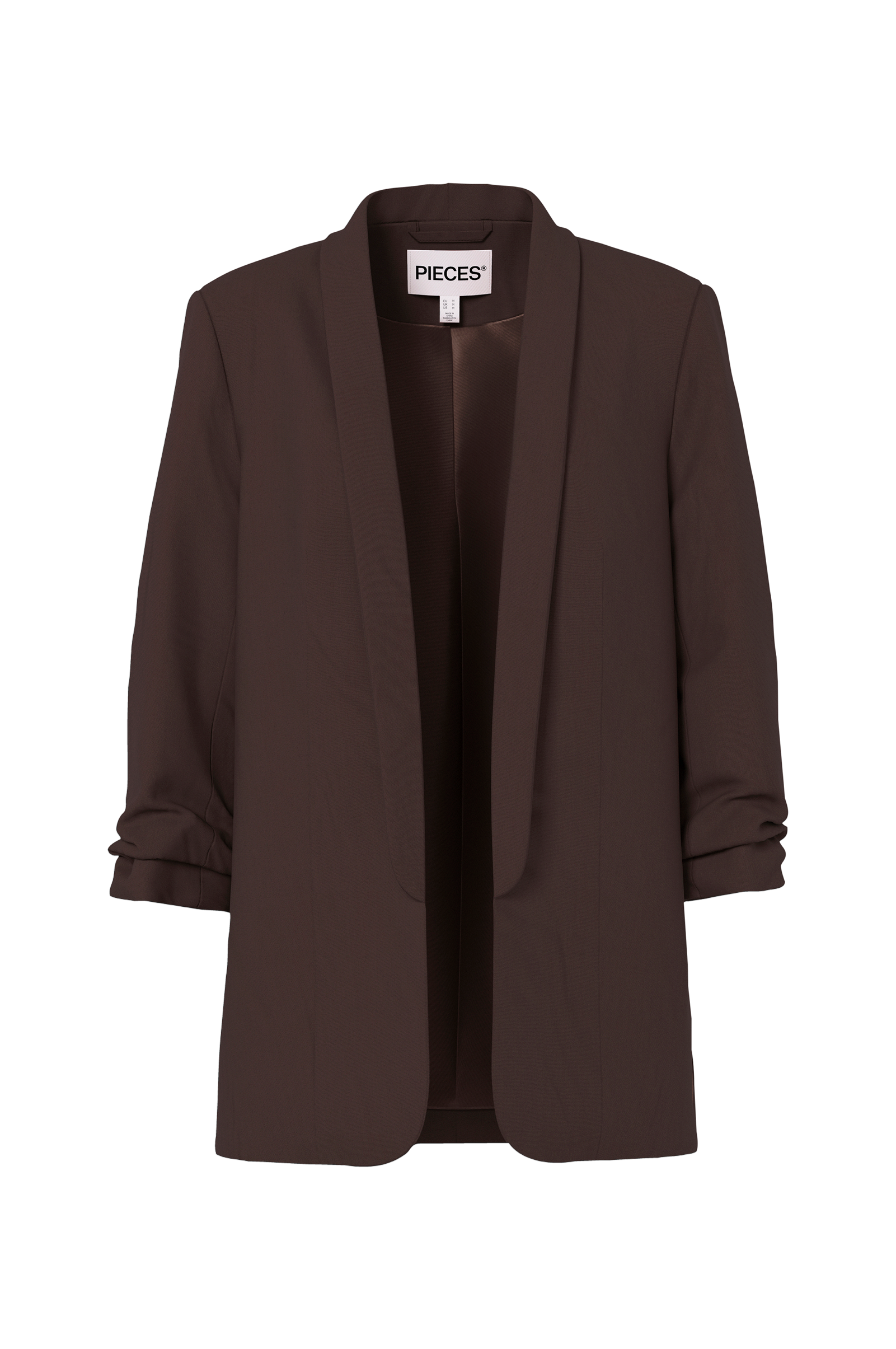 Kavaj pcBoss 3/4 Blazer från Pieces i öppen modell med sjalkrage och 3/4-långa ärmar med rynkad nederdel. Tunna axelvaddar ger fin passform. Gjord i vävd kvalitet med lätt stretch och tunt, vävt foder.