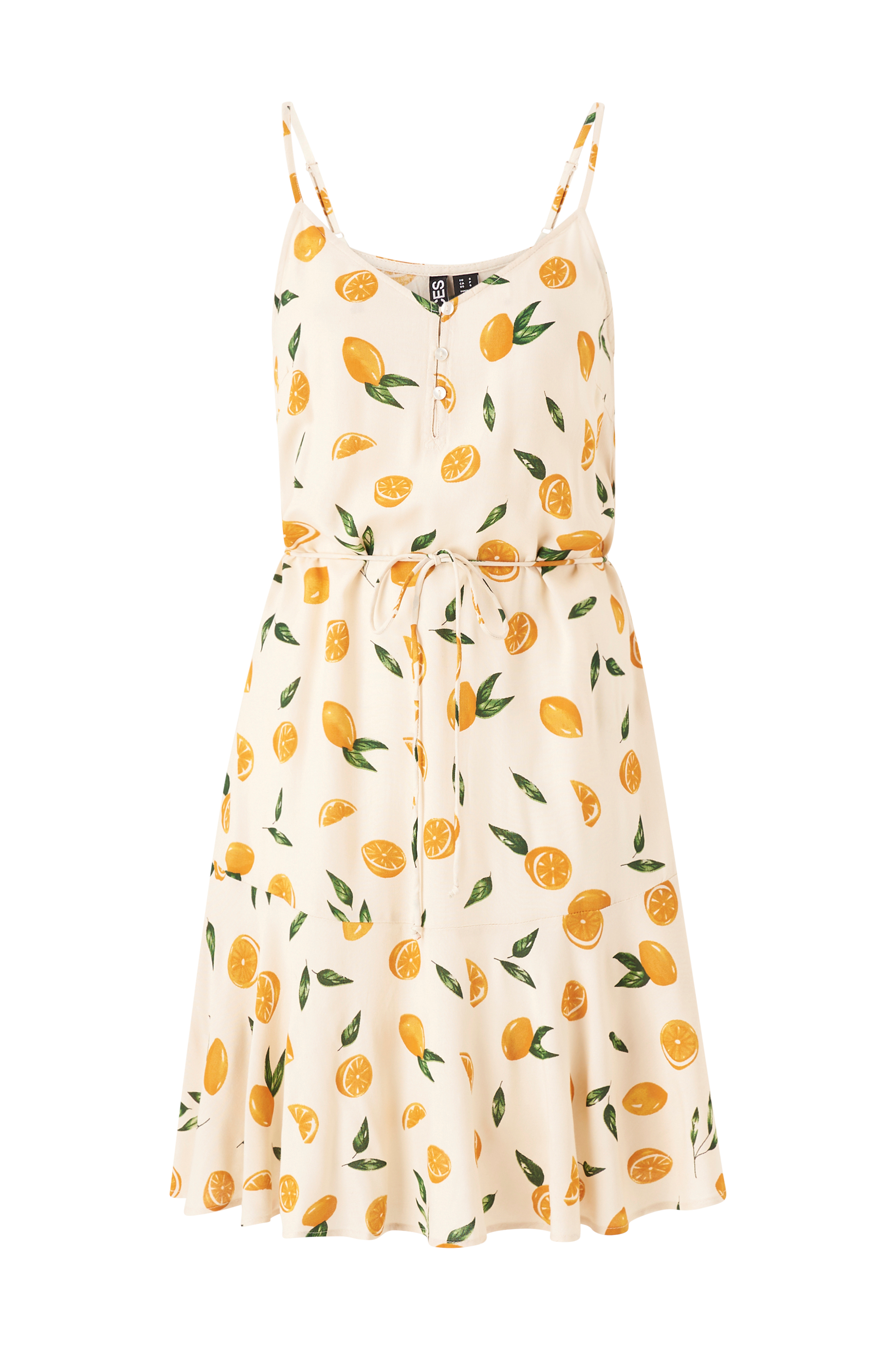 Klänning i vävd, mönstrad viskos. Knappar fram, volang nedtill, smalt knytskärp i midjan och smala, justerbara axelband. Längd ca 95 cm i stl S.