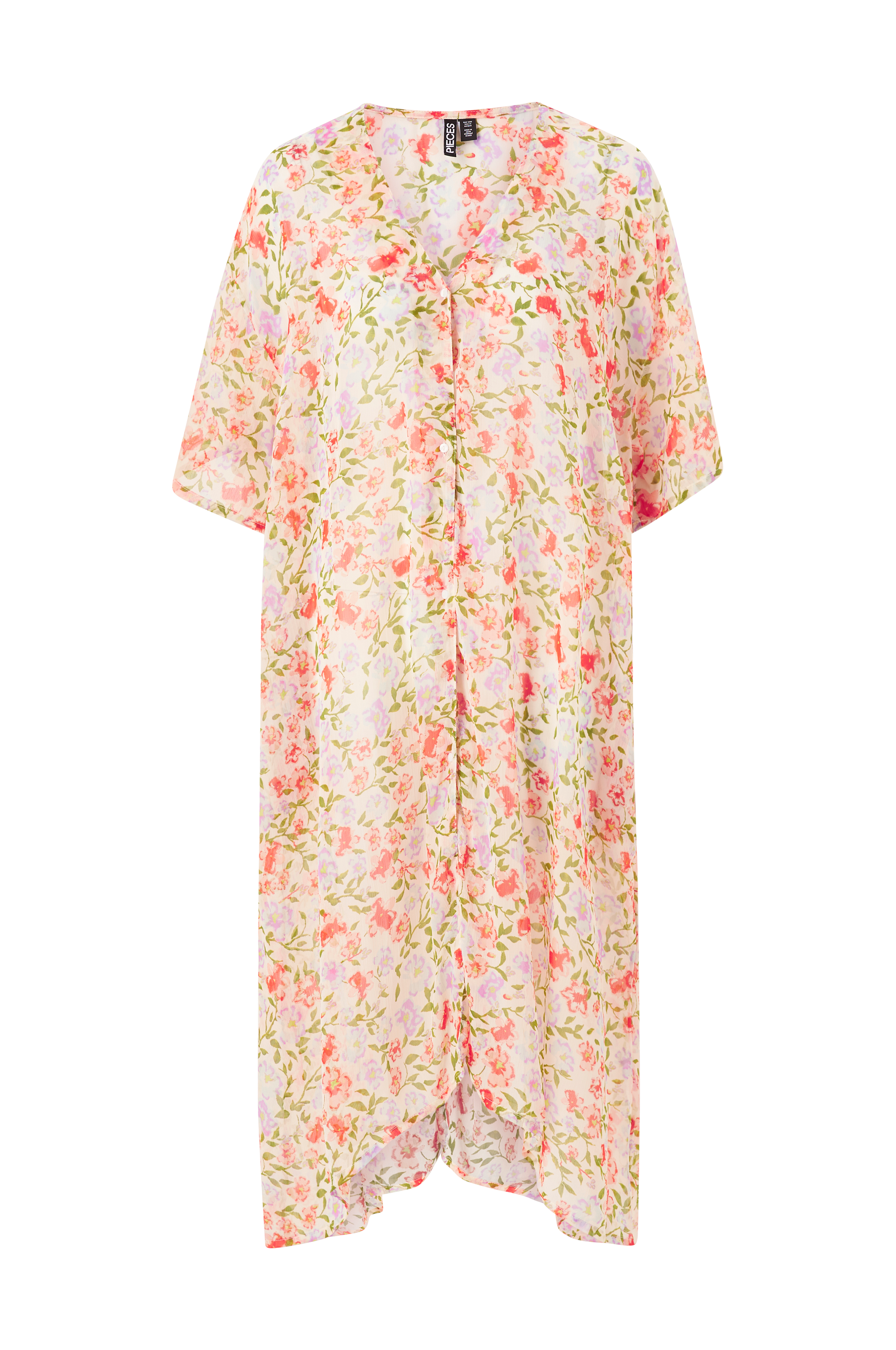 • Kaftan • Transparent material • Lös passform • V-ringning • Knappar fram • Korta ärmar • Fickor i sidorna • Längd: 118 cm i storlek one size • Produkten innehåller återvunnet material som har tagits tillvara för att minska mängden avfall, samtidigt som nya resurser inte har förbrukats.