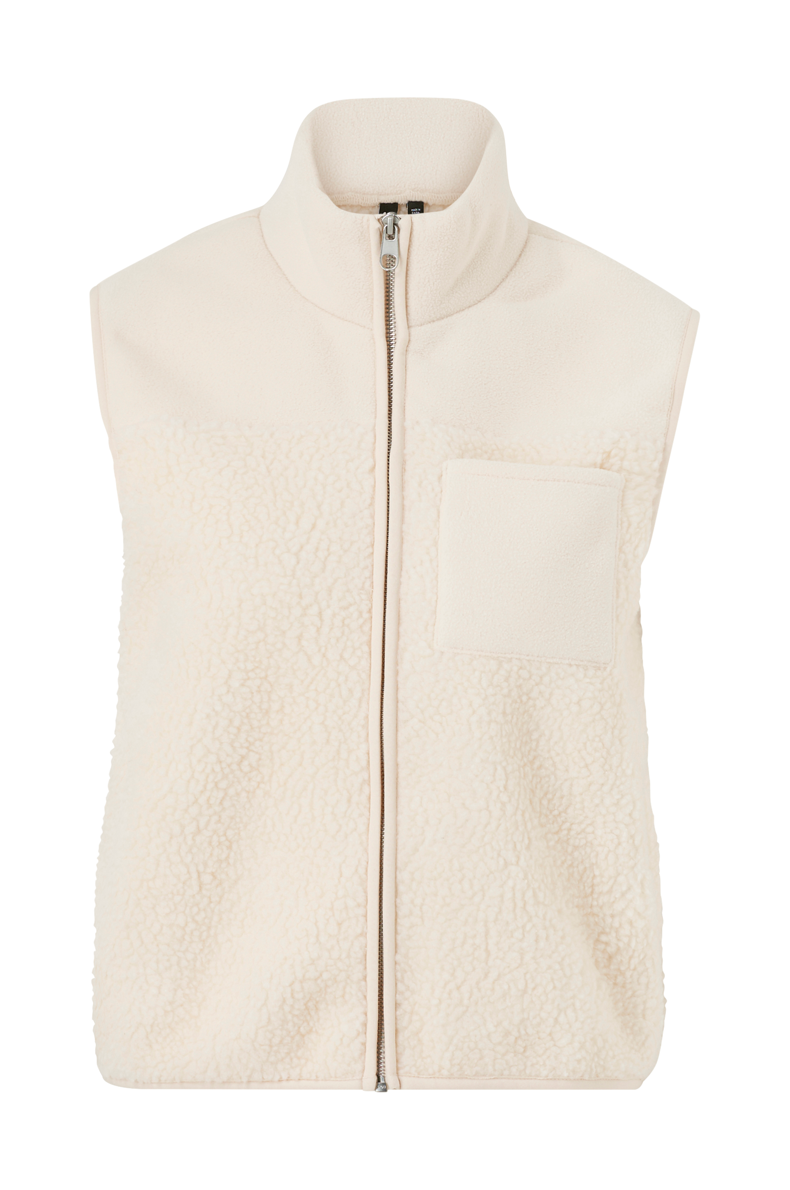 Väst i mjuk teddy med rak skärning. Dragkedja fram och hög krage samt en påsydd bröstficka. Infällda fickor i sidsömmarna. Längd ca 56 cm i stl S.