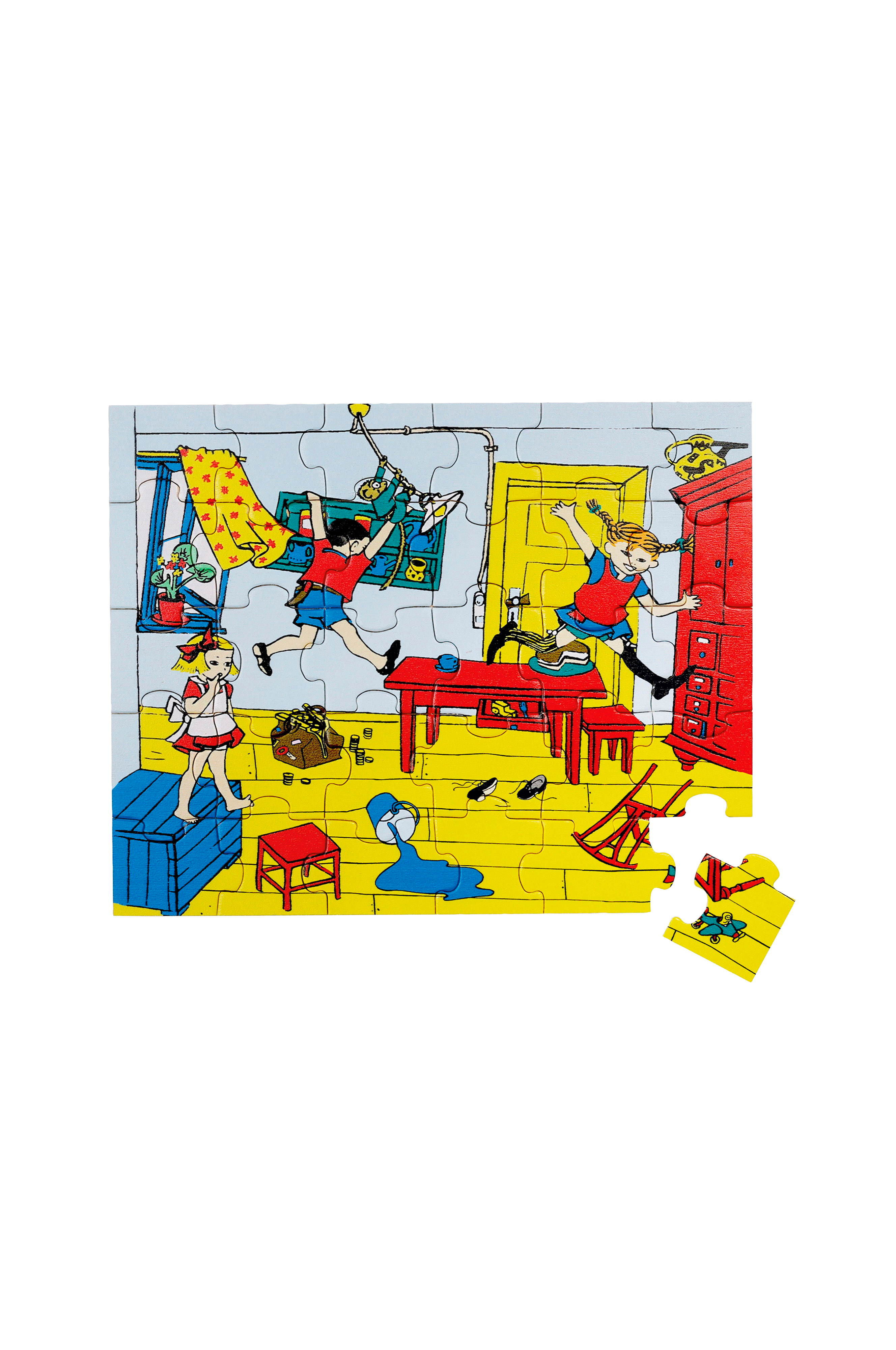 Ett roligt Pippipussel med illustration på Pippi, Tommy och Annika som stökar till ordentligt hemma i Villa Villekulla!