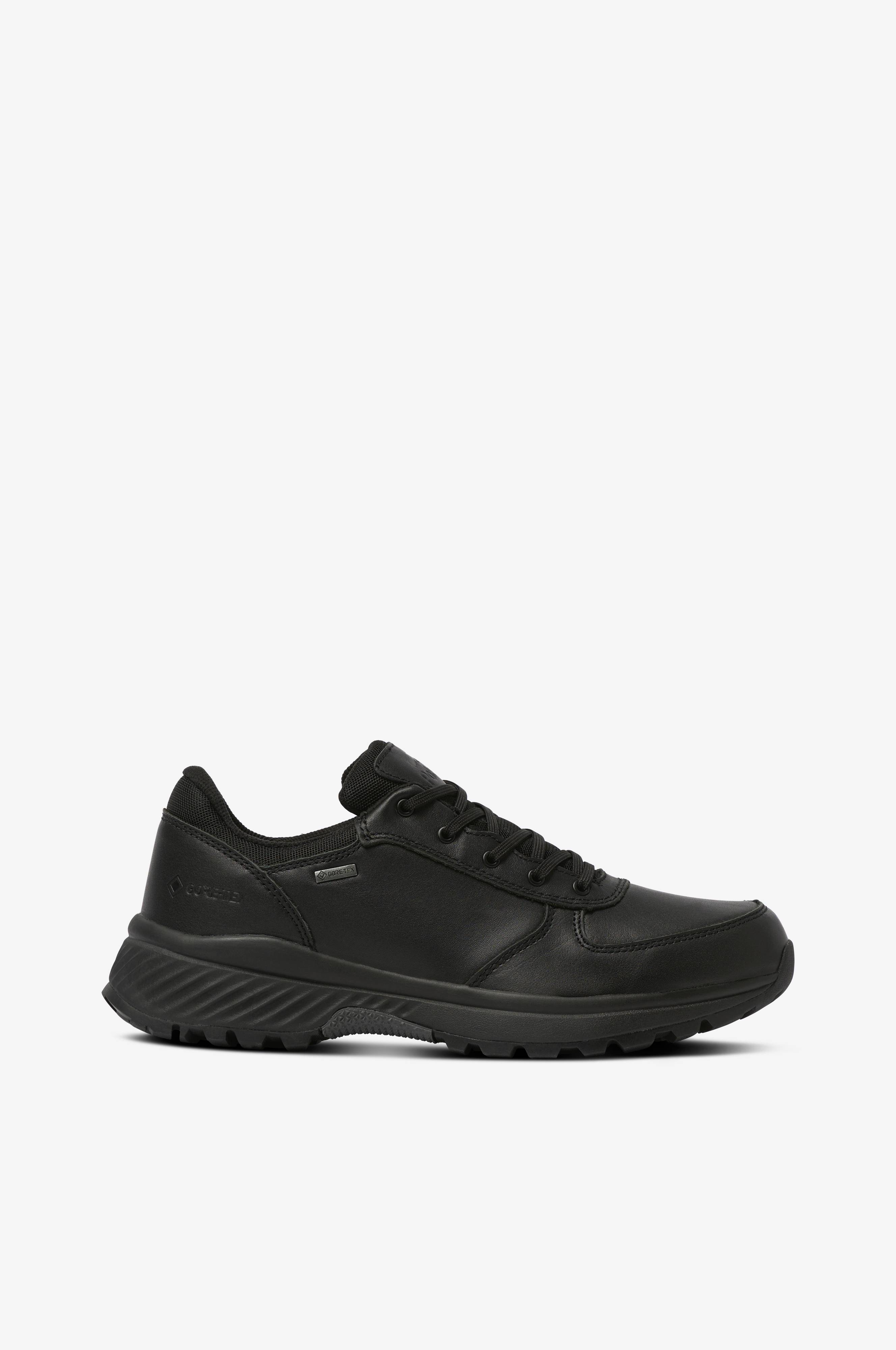 Stabila, sportiga skor i skinn med insida i textil. GoreTex-membran håller fötterna torra. Uttagbar innersula och grovmönstrad yttersula.
