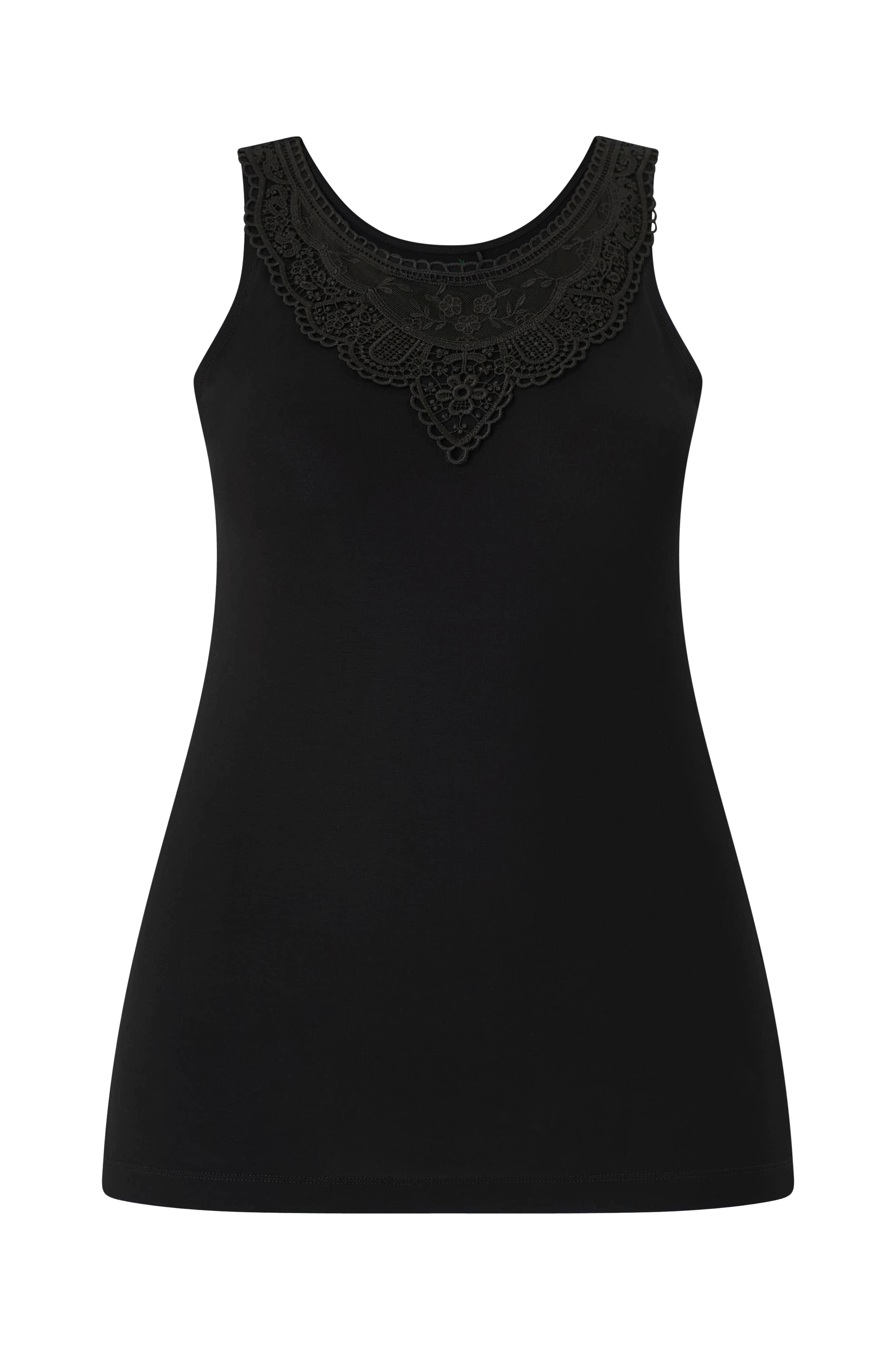 • Ärmlös modell i mjuk trikå• Rund hals med spets på bröstet