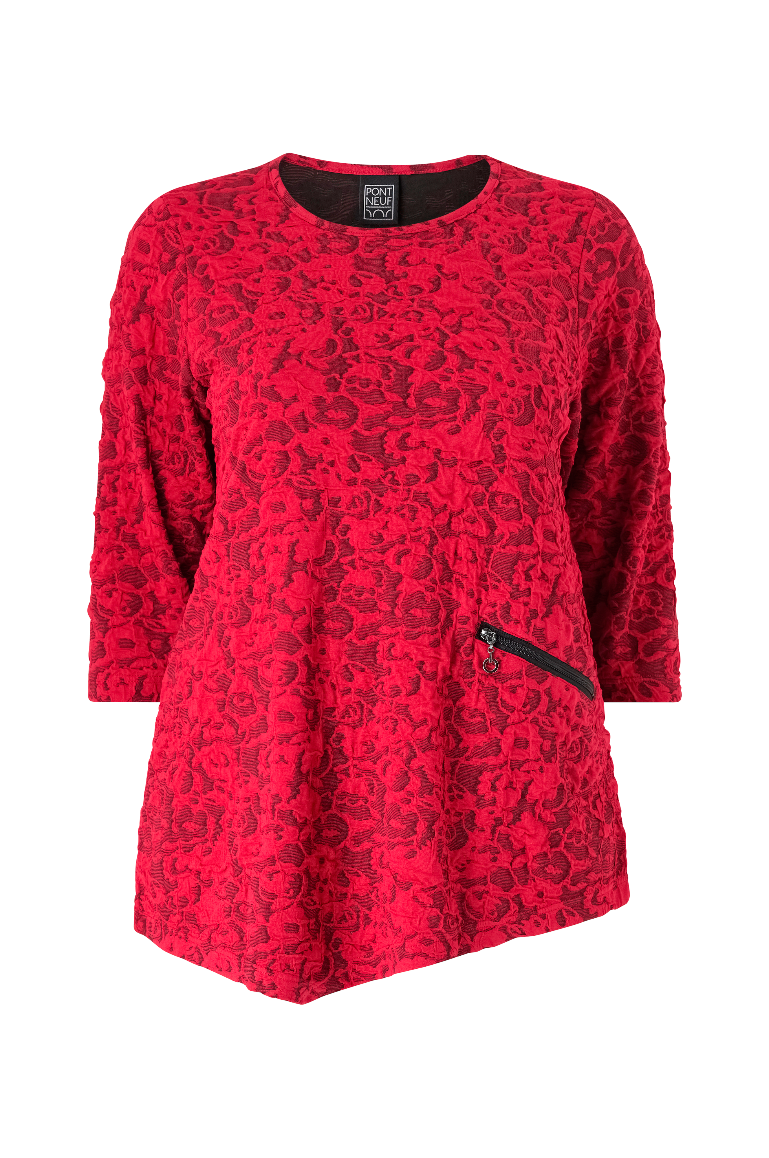 • Stretchig topp med struktur• Lös passform• Rund halsringning• 3/4-långa ärmar• Snedställd dragkedjeficka i ena sidan• Asymmetrisk nederkant• Plusstorlekar